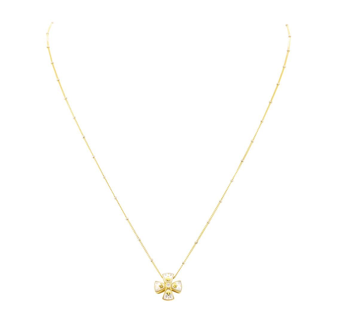 One 18KT yellow gold cross pendant attached to a 14KT yellow gold chain featuring: gold weighing 5.9 grams containing one diamond weighing 0.03ct, one pearl measuring 6.7 millimeter in diameter, and four pieces of inlaid mother of pearl.