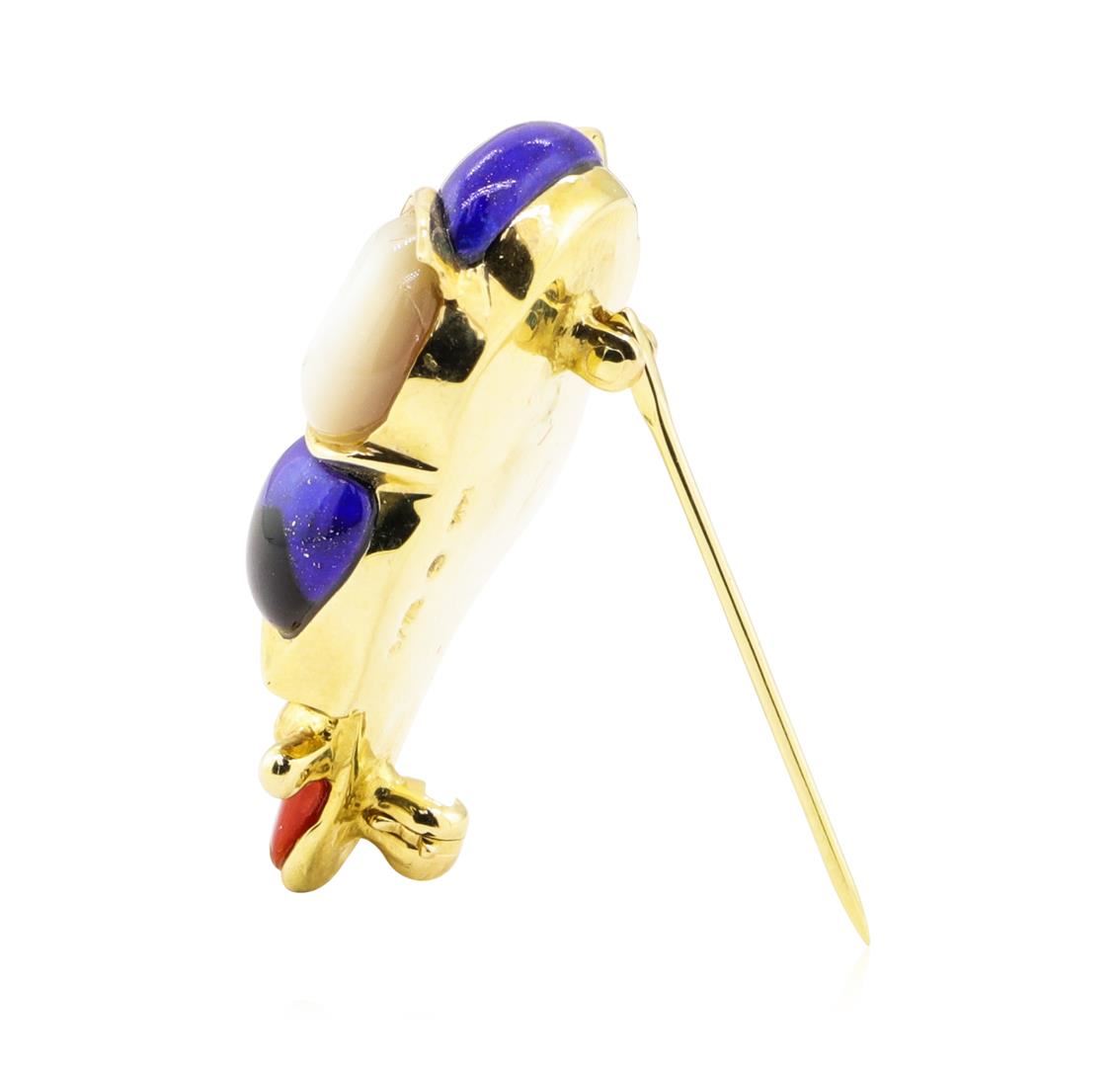 One owl shaped pin featuring: 14KT yellow gold weighing 8.6 grams containing two diamonds weighing 0.04ctw and inlaid pieces of mother of pearl, pink coral, red coral, lapis, and onyx.
