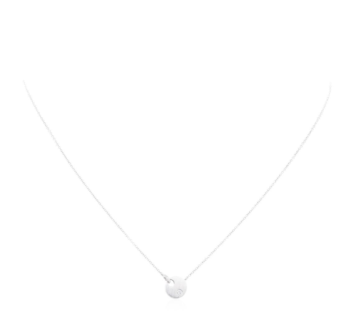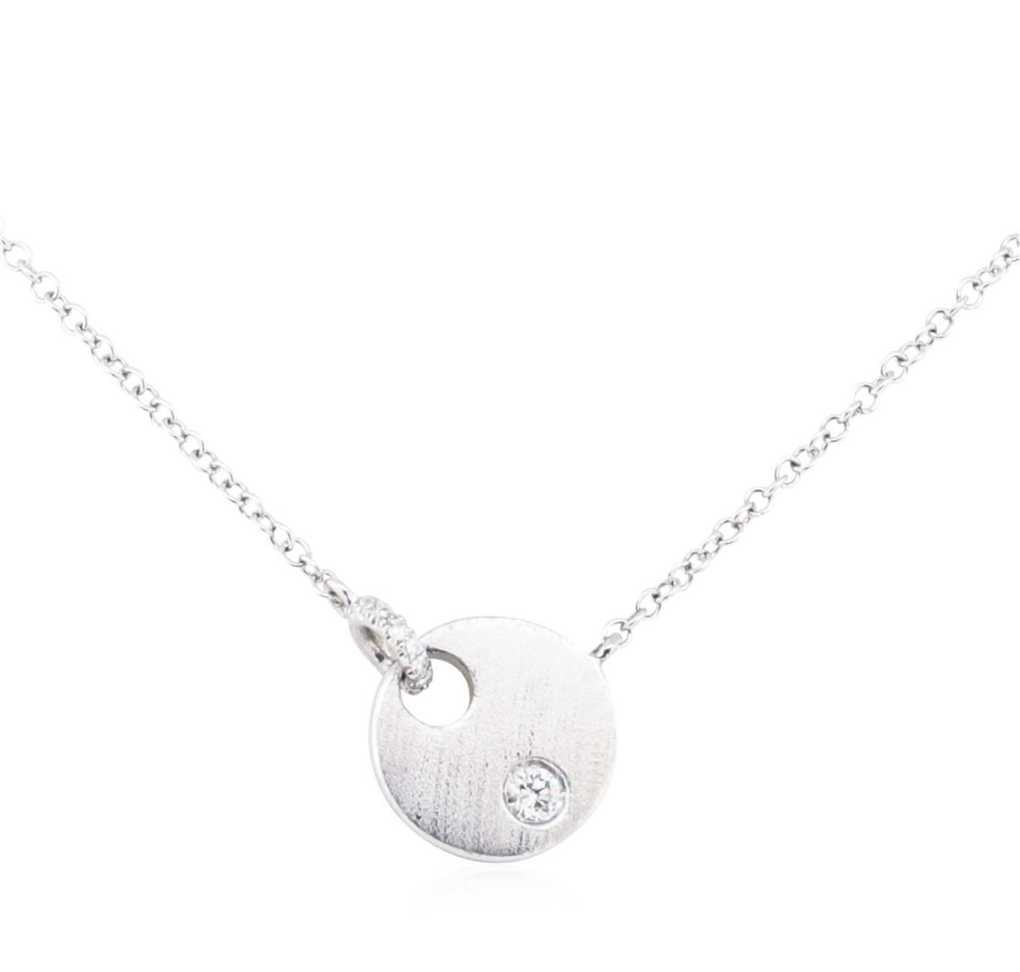One circle motif necklace with an attached 1.1mm rounded cable link chain that is adjustable and can be worn between sixteen and eighteen inches in length, featuring: 14KT white gold weighing 2.3 grams containing diamonds weighing 0.08ctw.