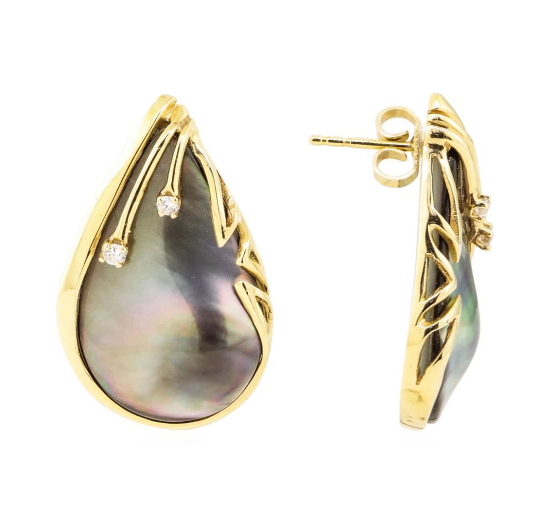 One pair of teardrop shaped earrings with a drop of 29 millimeters featuring: 14KT yellow gold weighing 10.0 grams containing diamonds weighing 0.10 ctw and two pieces of pear shaped black mother of pearl.