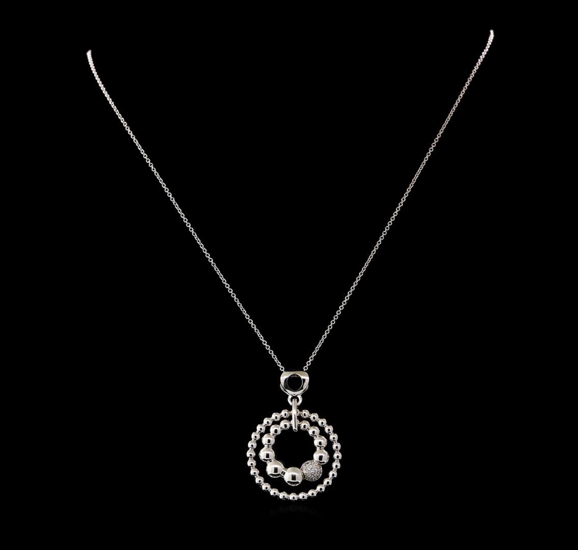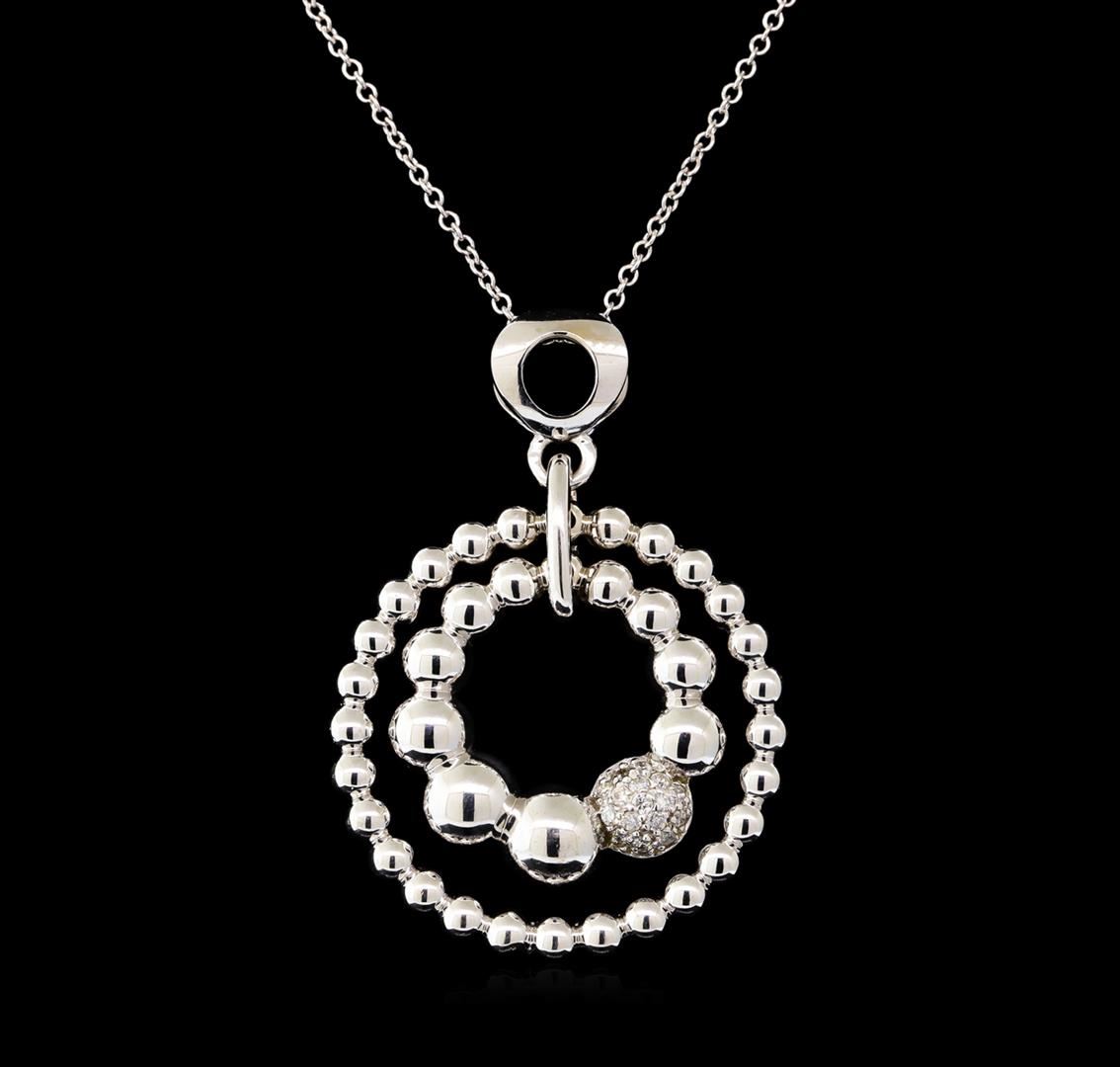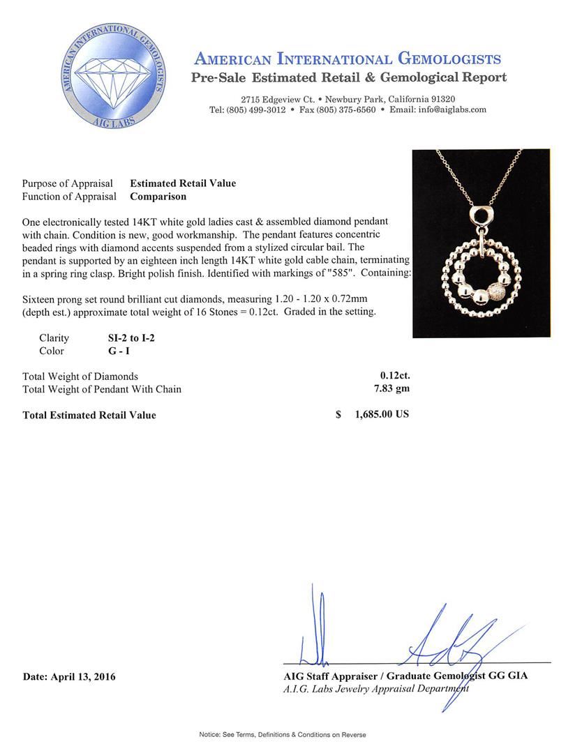 One electronically tested 14KT white gold ladies cast & assembled diamond pendant with chain. The pendant features concentric beaded rings with diamond accents suspended from a stylized circular bail. The pendant is supported by an eighteen inch length 14KT white gold cable chain, terminating in a spring ring clasp. Bright polish finish. Identified with markings of "585". Condition is new, good workmanship. Containing: Sixteen prong set round brilliant cut diamonds, measuring 1.20 - 1.20 x 0.72mm (depth est.) approximate total weight of 16 Stones = 0.12ct. Graded in the setting. Clarity: SI-2 to I-2. Color: G - I. Total Weight of Diamonds 0.12ct. Total Weight of Pendant With Chain 7.83gm. AIG Appraised.