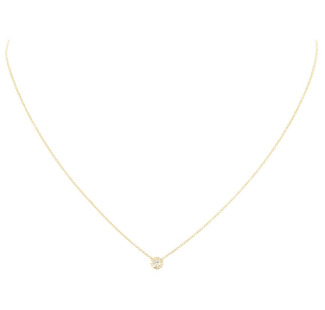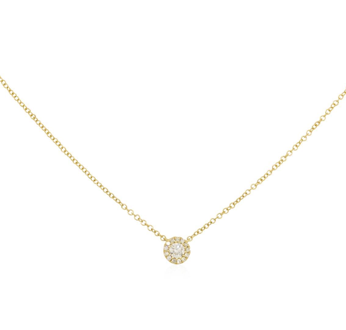 One lady's necklace featuring: 14KT yellow gold weighing 1.6 grams containing diamonds weighing 0.14ctw. The featured necklace can be worn between fifteen and eighteen inches in length.