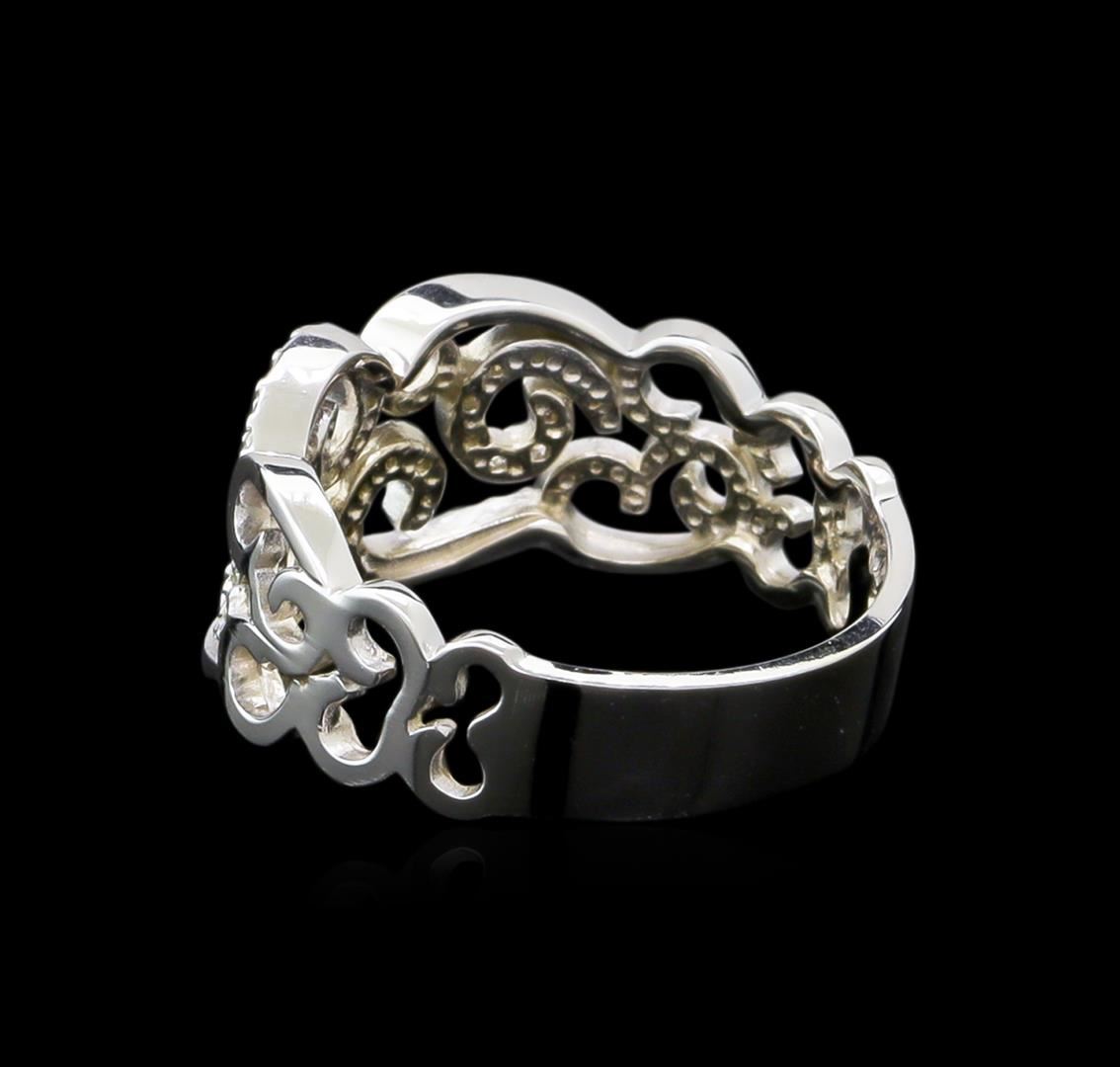 One electronically tested 14KT white gold ladies cast diamond ring with a bright polish finish. The ring features a diamond accented filigree cut-out design supported by tapering shoulders, completed by a four millimeter wide band. Identified with markings of "585". Condition is new, good workmanship. Containing: Forty prong set round brilliant cut diamonds, measuring 1.10 - 1.00 x 0.63mm (depth est.) approximate total weight of 40 Stones = 0.19ct. Graded in the setting. Clarity: I-1 to I-2. Color: G - I. Total Weight of Diamonds 0.19ct. Total Weight of Ring 3.85gm. AIG Appraised.