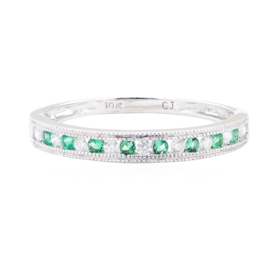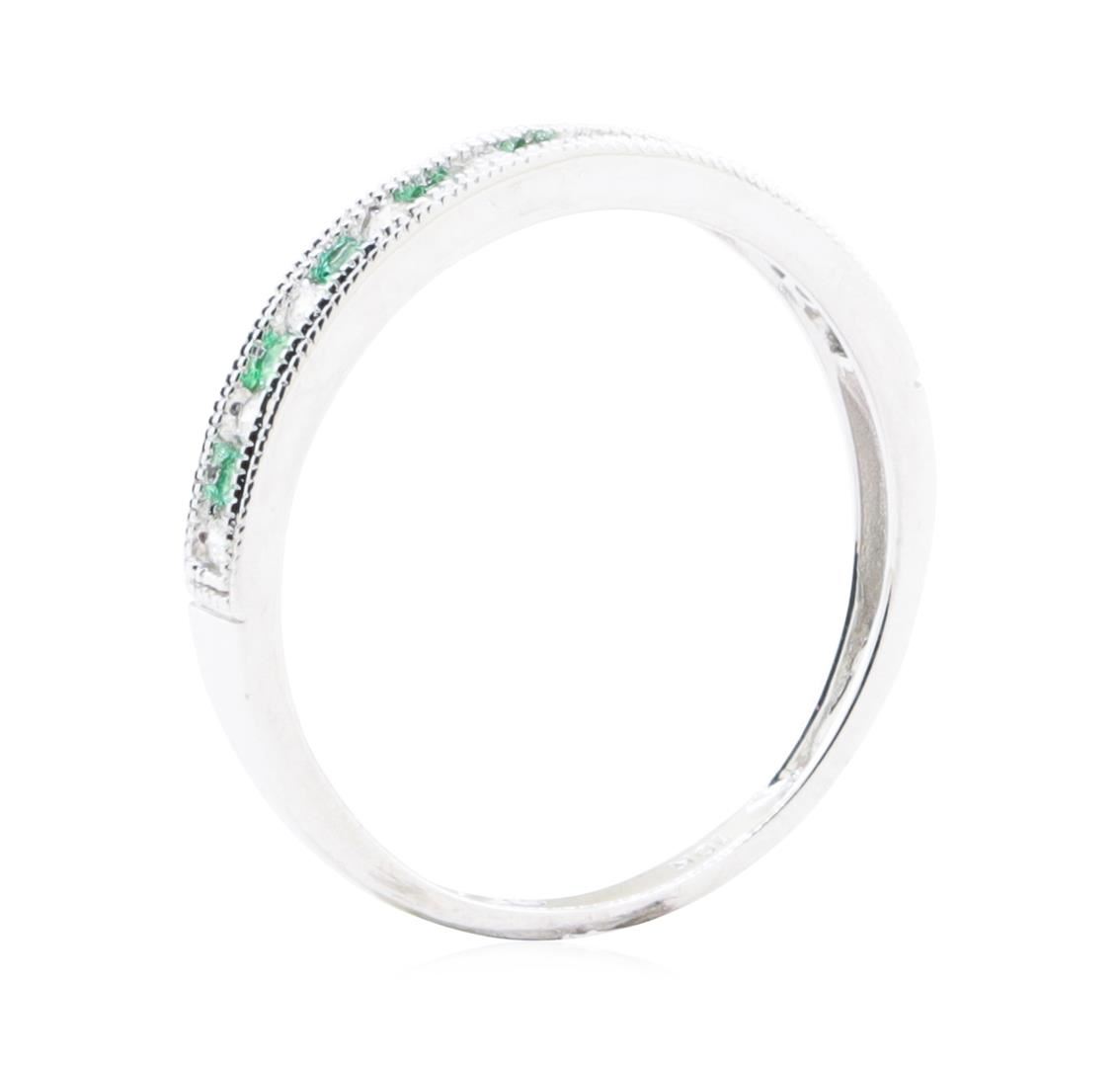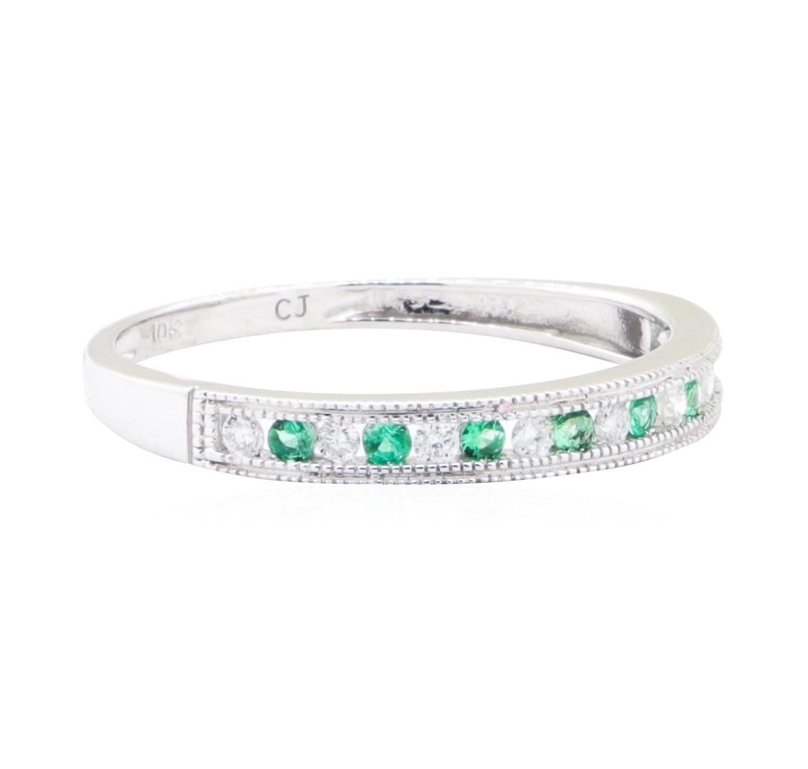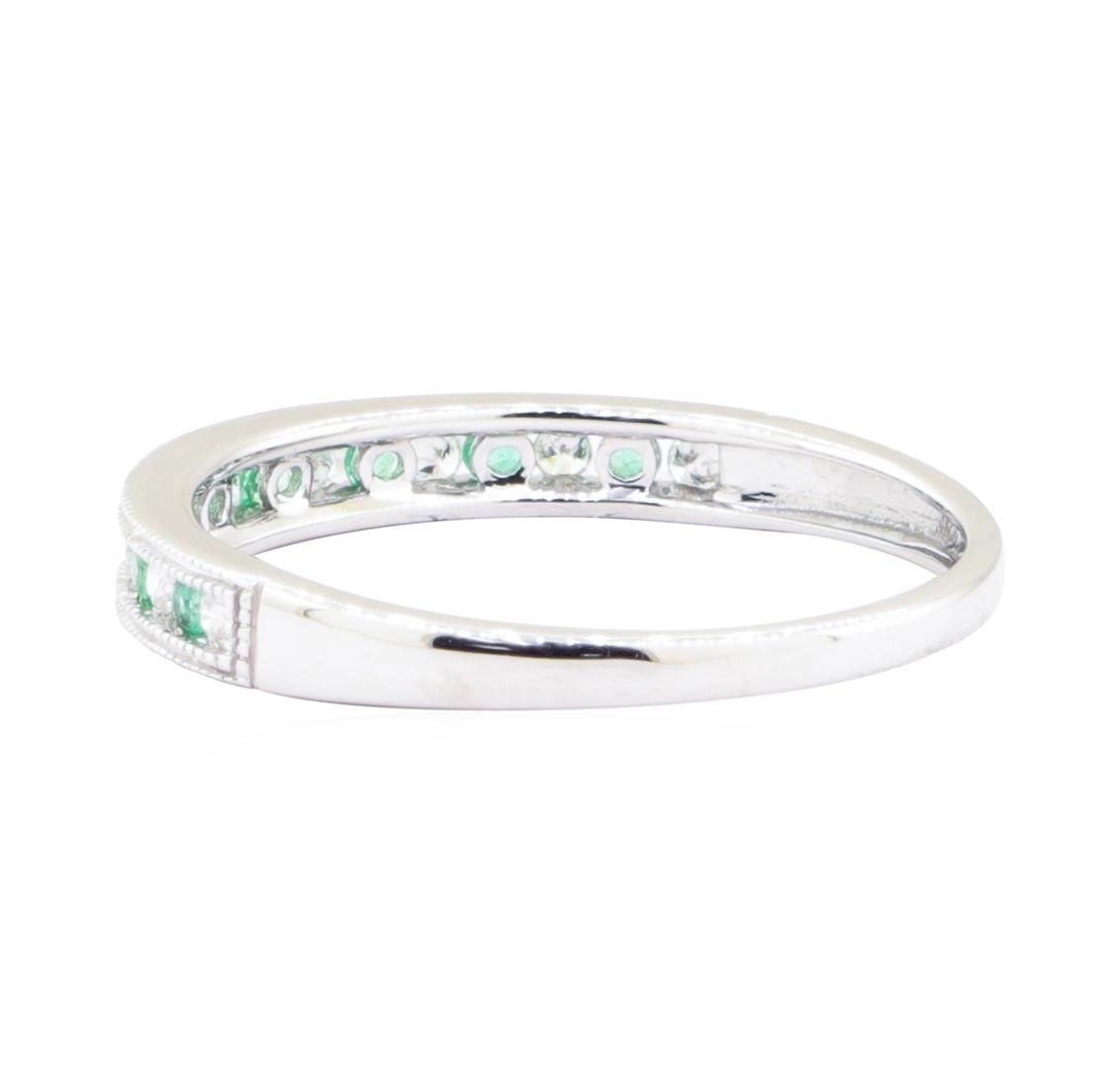 One straight-line double milgrain band featuring: 10KT white gold weighing 1.5 grams containing emeralds and diamonds weighing 0.22ctw.