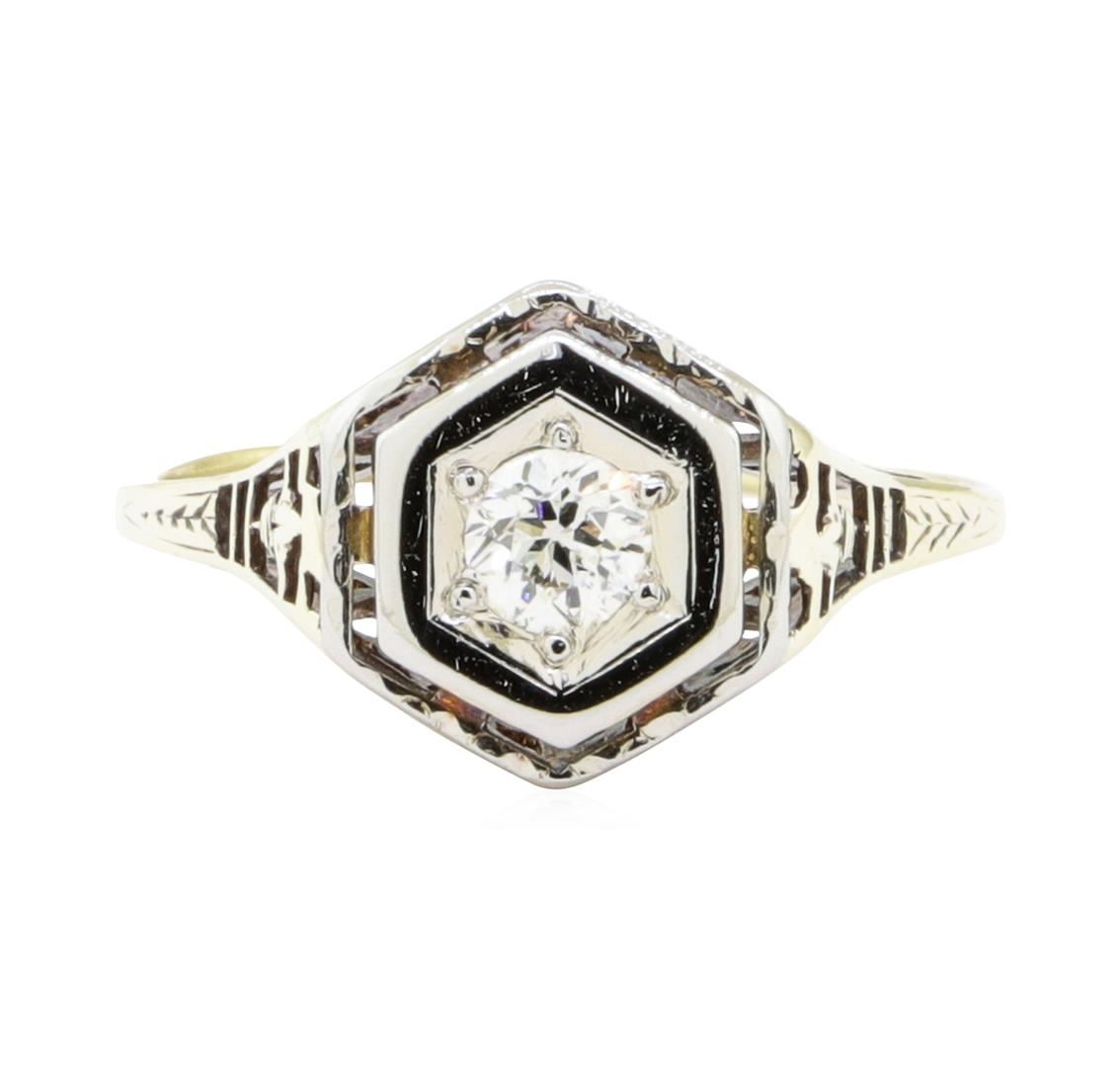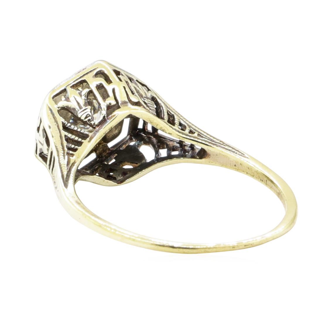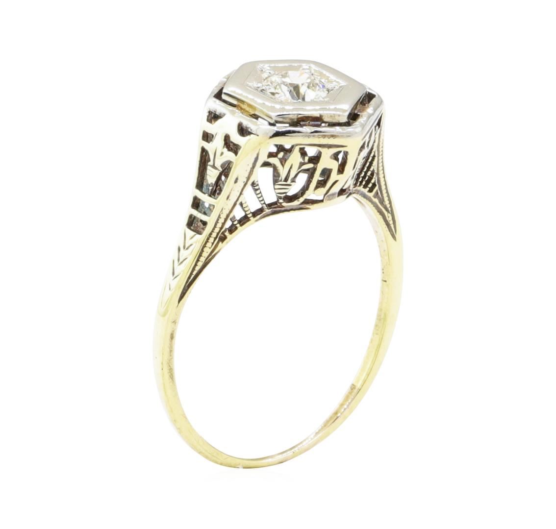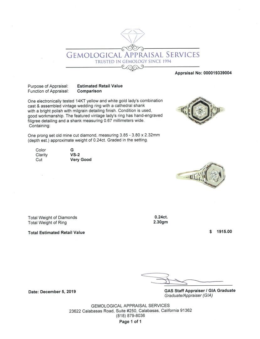 One electronically tested 14KT yellow and white gold lady's combination cast & assembled vintage wedding ring with a cathedral shank with a bright polish with milgrain detailing finish. The featured vintage lady's ring has hand-engraved filigree detailing and a shank measuring 0.67 millimeters wide. Condition is used, good workmanship. Containing: One prong set old mine cut diamond, measuring 3.85 - 3.80 x 2.32mm (depth est.) approximate weight of 0.24ct. Graded in the setting. Color G Clarity VS-2 Cut Very Good. Total Weight of Diamonds 0.24ct.. Total Weight of Ring 2.30gm GAS Appraised at $1915.00. GAS Appraised.