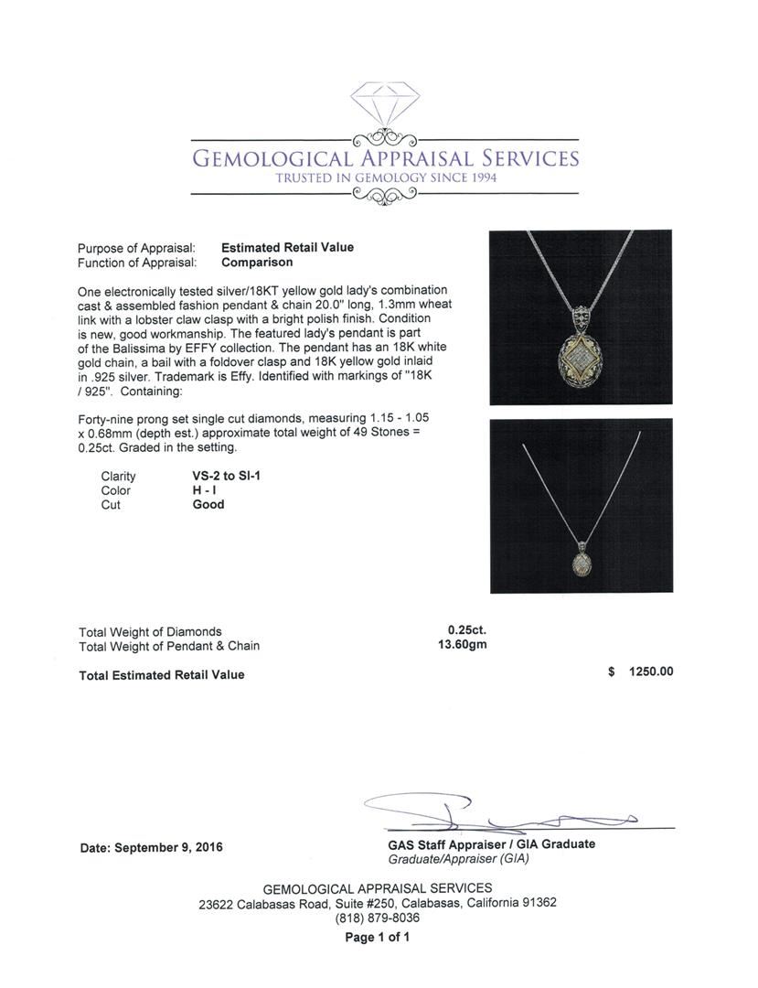 One electronically tested silver/18KT yellow gold lady's combination cast & assembled fashion pendant & chain 20.0' long, 1.3mm wheat link with a lobster claw clasp with a bright polish finish. The featured lady's pendant is part of the Balissima by EFFY collection. The pendant has an 18K white gold chain, a bail with a foldover clasp and 18K yellow gold inlaid in.925 silver. Trademark is Effy. Identified with markings of '18K / 925'. Condition is new, good workmanship. Containing: Forty-Nine prong set single cut diamonds, measuring 1.15 - 1.05 x 0.68mm (depth est.) approximate total weight of 49 Stones = 0.25ct. Graded in the setting. Clarity VS-2 to SI-1. Color: H - I Cut Good. Total Weight of Diamonds 0.25ct.. Total Weight of Pendant & Chain 13.60gm GAS Appraised.
