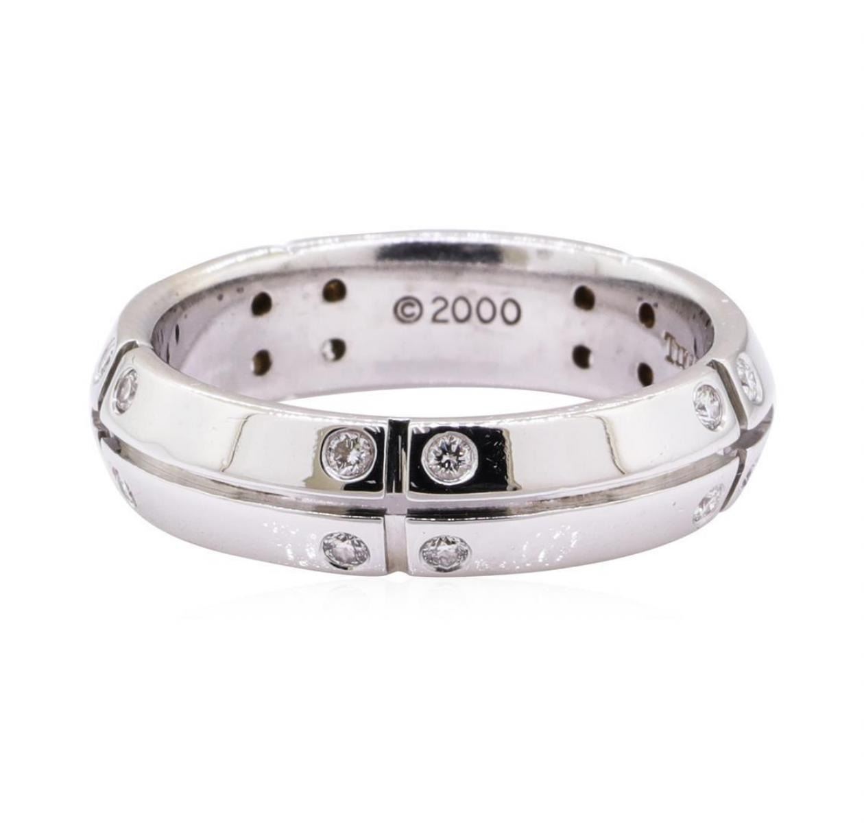 One electronically tested 18KT white gold lady's cast fashion designer ring with a knife edge band with a bright polish finish. The featured lady's ring is from the Streamerica collection and has a shank measuring 5.00 millimeters wide. Trademark is Tiffany & Co. Identified with markings of '750'. Condition is like new, good workmanship. Containing: Twenty bezel set round brilliant cut diamonds, measuring 1.50 - 1.45 x 0.92mm (depth est.) approximate total weight of 20 Stones = 0.25ct. Graded in the setting. Color F - G Clarity VS-1 to VS-2 Cut Very Good. Total Weight of Diamonds 0.25ct.. Total Weight of Ring 6.30gm GAS Appraised at $1950.00. GAS Appraised.