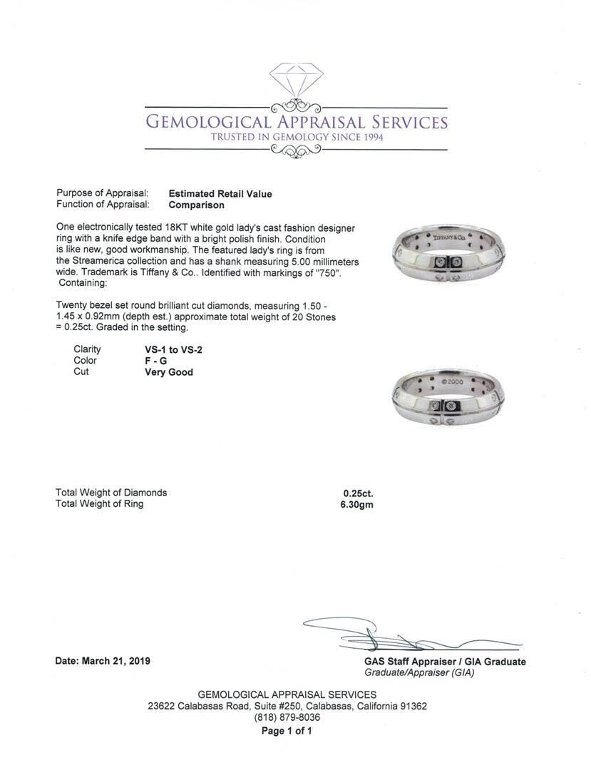One electronically tested 18KT white gold lady's cast fashion designer ring with a knife edge band with a bright polish finish. The featured lady's ring is from the Streamerica collection and has a shank measuring 5.00 millimeters wide. Trademark is Tiffany & Co. Identified with markings of '750'. Condition is like new, good workmanship. Containing: Twenty bezel set round brilliant cut diamonds, measuring 1.50 - 1.45 x 0.92mm (depth est.) approximate total weight of 20 Stones = 0.25ct. Graded in the setting. Color F - G Clarity VS-1 to VS-2 Cut Very Good. Total Weight of Diamonds 0.25ct.. Total Weight of Ring 6.30gm GAS Appraised at $1950.00. GAS Appraised.
