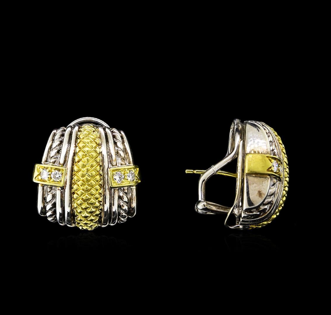 One pair electronically tested 925 silver ladies cast & assembled diamond earrings with omega backs. Each earring is part of Judith Ripka's Two Collection. Two mirroring diamond ribbons accent either side of the rope detailed gallery. Bright polish finish with 18KT yellow gold accents. Trademark is JR TWO. Identified with markings of "925 18K". Condition is good. Containing: Eight bead set round brilliant cut diamonds, measuring 2.00 - 2.00 x 1.20mm (depth est.) approximate total weight of 8 Stones = 0.25ct. Graded in the setting. Clarity: SI-1 to SI-2. Color: F - G. Total Weight of Diamonds 0.25ct. Total Weight of Earrings 19.10gm. AIG Appraised.