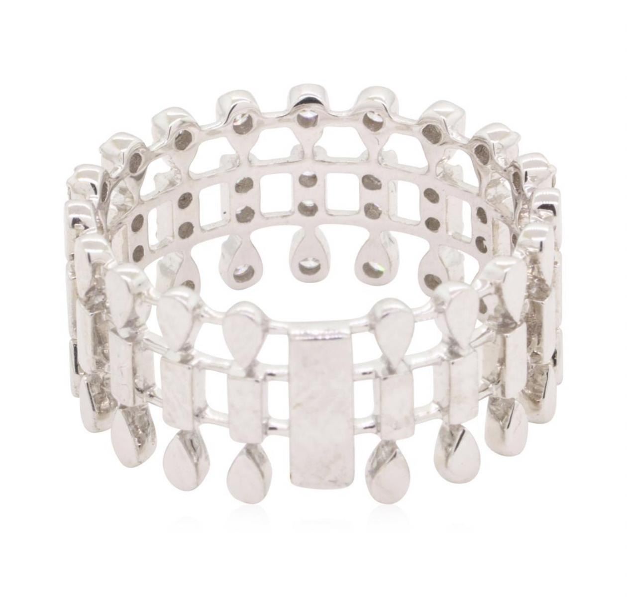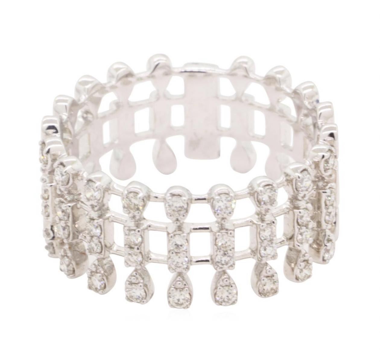 One electronically tested 14KT white gold lady's cast fashion ring with a three row wide band with a bright polish finish. This featured lady's ring has a shank measuring 9.32 millimeters in width. Identified with markings of '14K'. Condition is new, good workmanship. Containing: Eighteen prong set round brilliant cut diamonds, measuring 1.60 - 1.50 x 0.96mm (depth est.) approximate total weight of 18 Stones = 0.25ct. Graded in the setting. Color G - H Clarity VS-2 to SI-1 Cut Very Good Eighteen prong set round brilliant cut diamonds, measuring 1.40 - 1.35 x 0.86mm (depth est.) approximate total weight of 18 Stones = 0.20ct. Graded in the setting. Color G - H Clarity VS-2 to SI-1 Cut Very Good. Total Weight of Diamonds 0.45ct.. Total Weight of Ring 4.10gm GAS Appraised at $2065.00. GAS Appraised.
