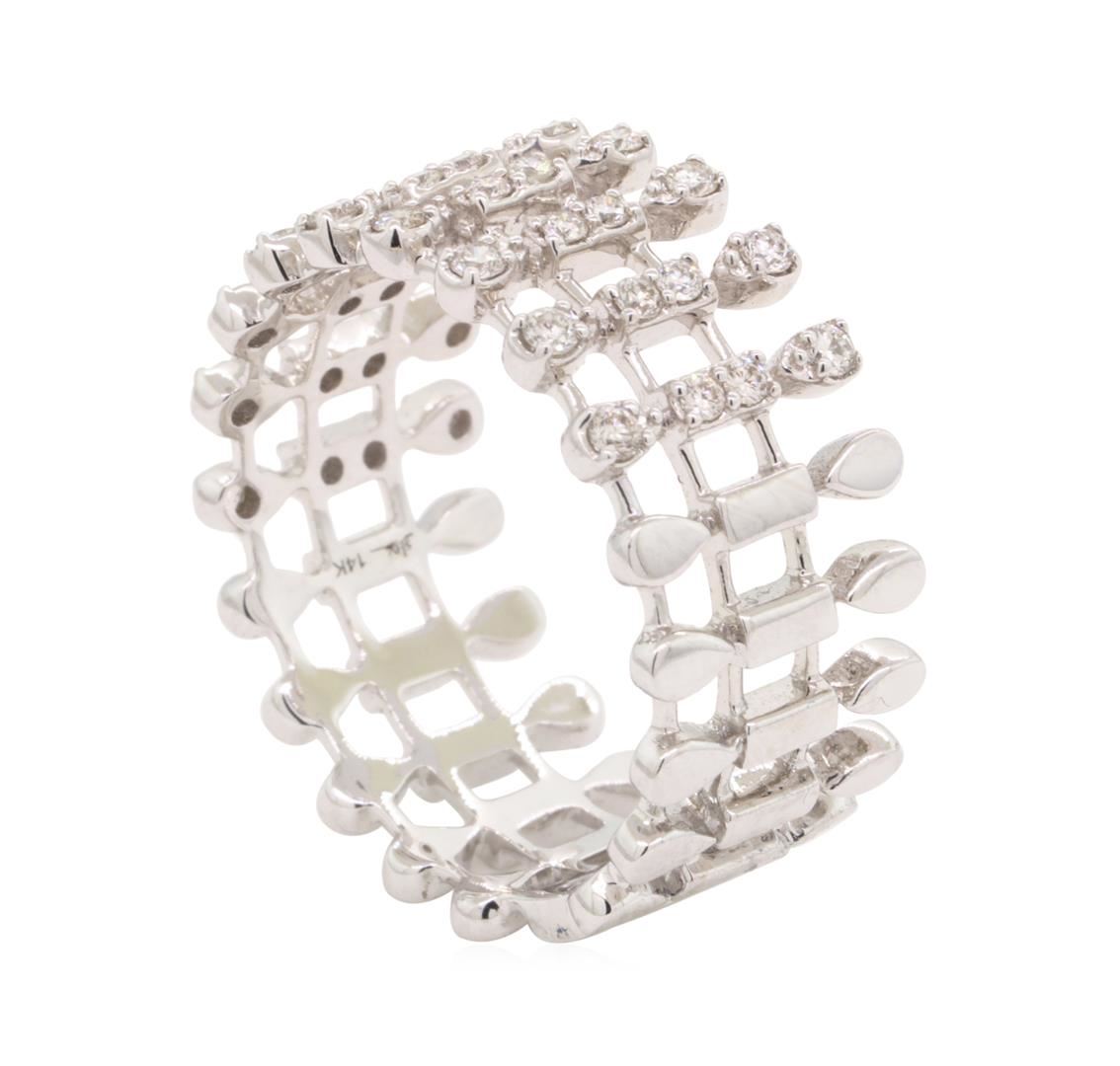 One electronically tested 14KT white gold lady's cast fashion ring with a three row wide band with a bright polish finish. This featured lady's ring has a shank measuring 9.32 millimeters in width. Identified with markings of '14K'. Condition is new, good workmanship. Containing: Eighteen prong set round brilliant cut diamonds, measuring 1.60 - 1.50 x 0.96mm (depth est.) approximate total weight of 18 Stones = 0.25ct. Graded in the setting. Color G - H Clarity VS-2 to SI-1 Cut Very Good Eighteen prong set round brilliant cut diamonds, measuring 1.40 - 1.35 x 0.86mm (depth est.) approximate total weight of 18 Stones = 0.20ct. Graded in the setting. Color G - H Clarity VS-2 to SI-1 Cut Very Good. Total Weight of Diamonds 0.45ct.. Total Weight of Ring 4.10gm GAS Appraised at $2065.00. GAS Appraised.