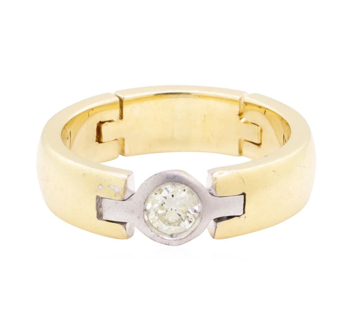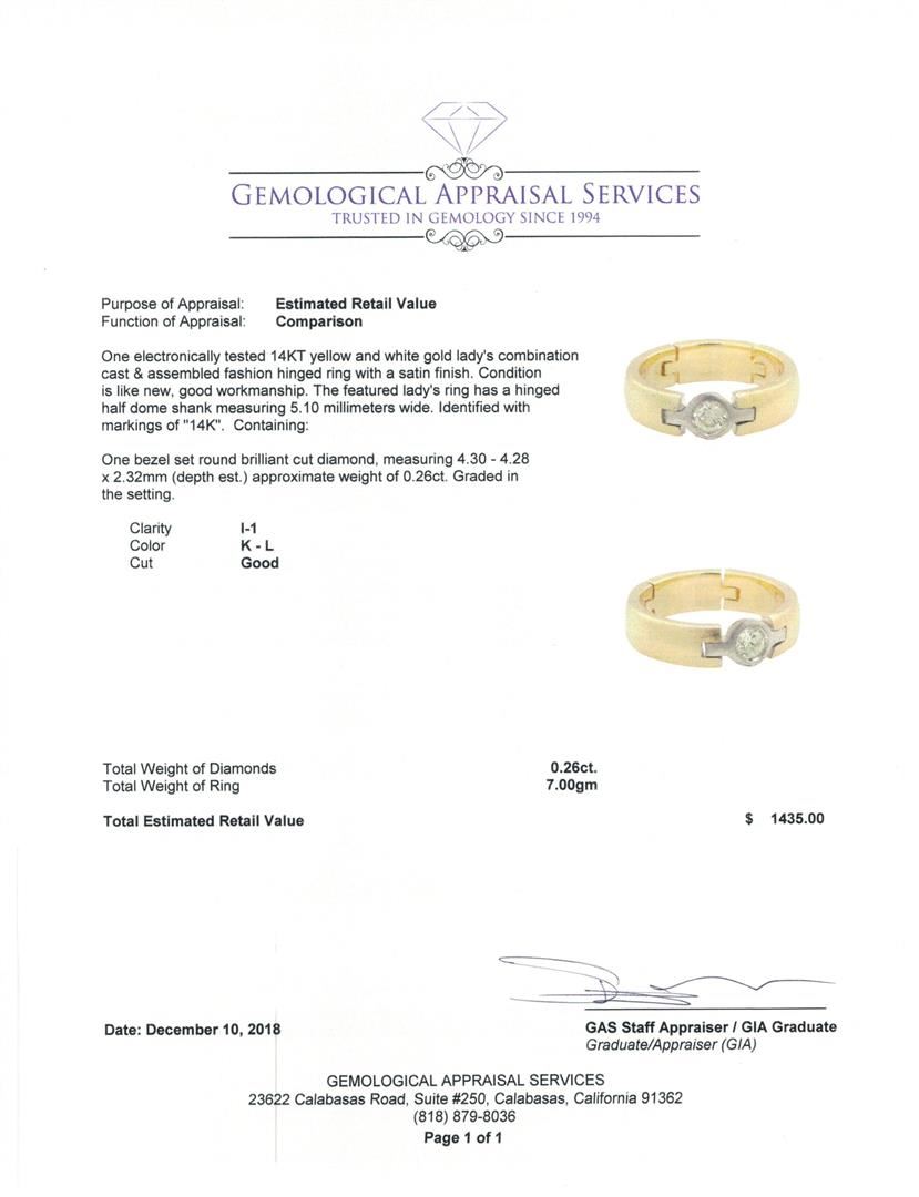 One electronically tested 14KT yellow and white gold lady's combination cast & assembled fashion hinged ring with a satin finish. The featured lady's ring has a hinged half dome shank measuring 5.10 millimeters wide. Identified with markings of '14K'. Condition is like new, good workmanship. Containing: One bezel set round brilliant cut diamond, measuring 4.30 - 4.28 x 2.32mm (depth est.) approximate weight of 0.26ct. Graded in the setting. Color K - L Clarity I-1 Cut Good. Total Weight of Diamonds 0.26ct.. Total Weight of Ring 7.00gm GAS Appraised at $1435.00. GAS Appraised.