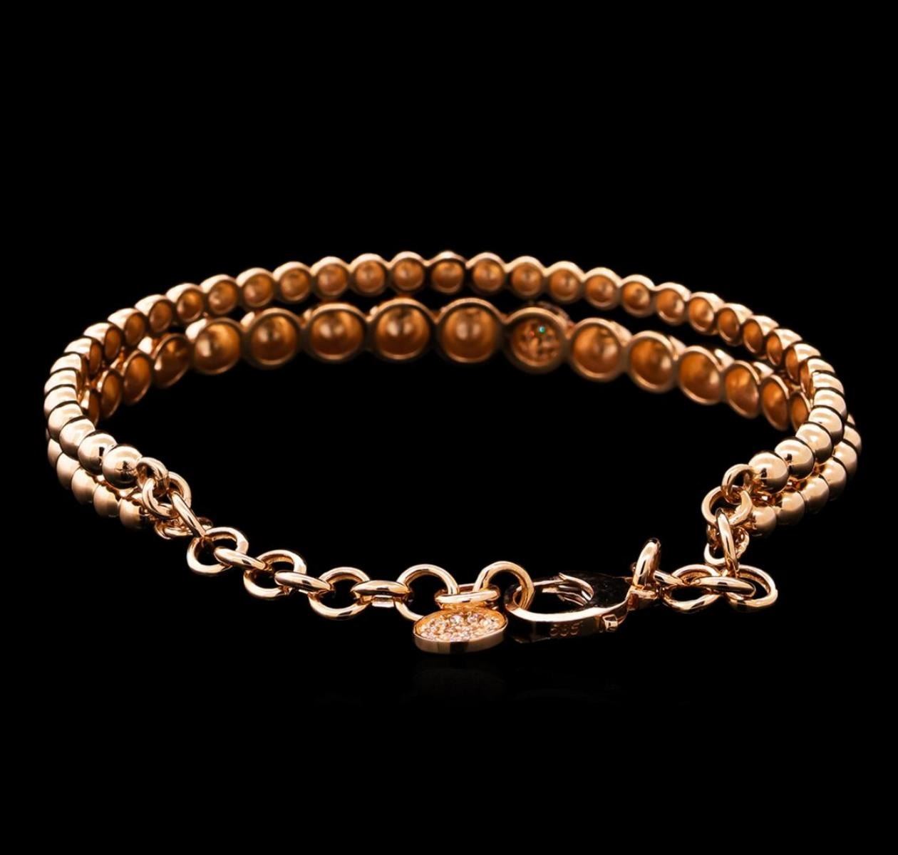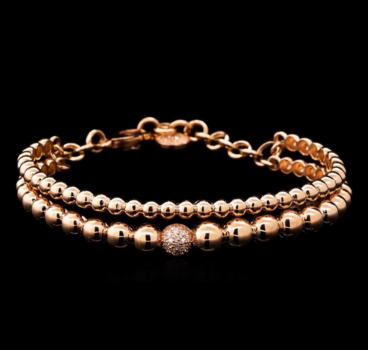 One electronically tested 14KT rose gold lady's combination cast & assembled fashion bangle bracelet with a lobster claw clasp with a bright polish finish. The featured lady's bracelet contains two parallel connected bangles measuring approximately seven inches in circumference. Identified with markings of "585". Condition is new, good workmanship. Containing: Twenty-Six prong set round brilliant cut diamonds, measuring 1.30 - 1.20 x 0.75mm (depth est.) approximate total weight of 26 Stones = 0.18ct. Graded in the setting. Clarity: SI-1 to SI-2. Color: H - I. Cut Good Nineteen prong set round brilliant cut diamonds, measuring 1.15 - 1.10 x 0.69mm (depth est.) approximate total weight of 19 Stones = 0.10 ct. Graded in the setting. Clarity: SI-1 to SI-2. Color: H - I. Cut Good. Total Weight of Diamonds 0.28ct. Total Weight of Bangle Bracelet 17.30gm. GAS Appraised.