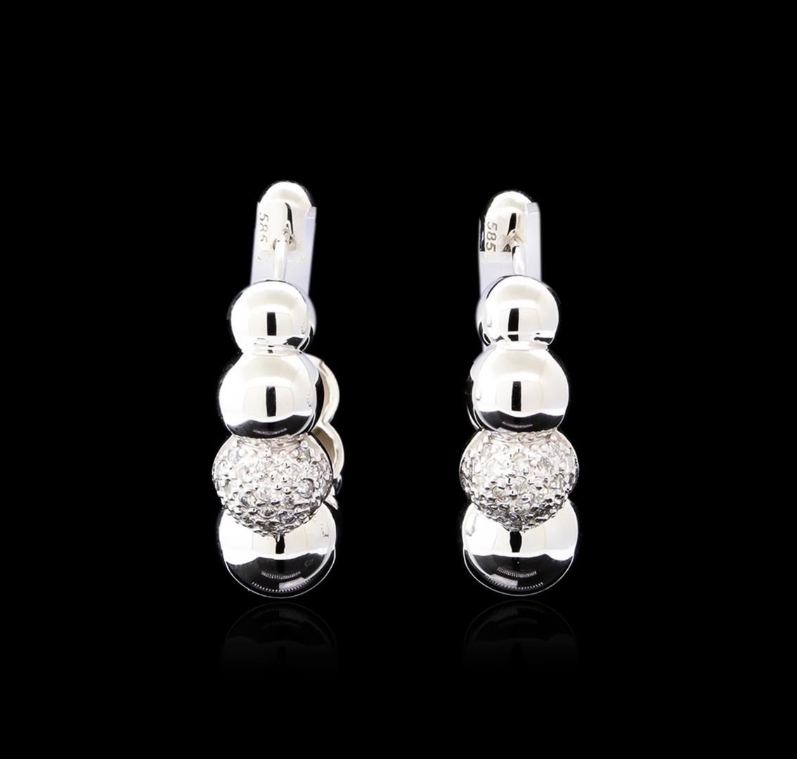 One pair electronically tested 14KT white gold ladies cast & assembled diamond hoop earrings with hinged, snap locking posts. Each earring features a graduating beaded hoop with diamond accents. Bright polish finish. Identified with markings of "585". Condition is new, good workmanship. Containing: Fifty-Four prong set round brilliant cut diamonds, measuring 1.20 - 1.00 x 0.66mm (depth est.) approximate total weight of 54 Stones = 0.28ct. Graded in the setting. Clarity: SI-2 to I-2. Color: G - I. Total Weight of Diamonds 0.28ct. Total Weight of Earrings 8.10gm. AIG Appraised.