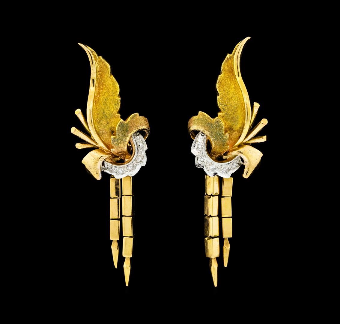 One pair electronically tested 18KT yellow with rhodium plating gold lady's combination cast & assembled fashion floral dangle earrings with Omega clip backs with posts with a bright polish and satin finish. The featured pair of lady's earrings have a dangle of approximately 63 millimeters and have rhodium plating on areas where diamonds have been set. Identified with markings of '18K'. Condition is used, good workmanship. Containing: Ten bead set round brilliant cut diamonds, measuring 2.00 - 1.90 x 1.21mm (depth est.) approximate total weight of 10 Stones = 0.28ct. Graded in the setting. Color H - I Clarity SI-2 to I-1 Cut Good. Total Weight of Diamonds 0.28ct.. Total Weight of Earrings 18.10gm. GAS Appraised.