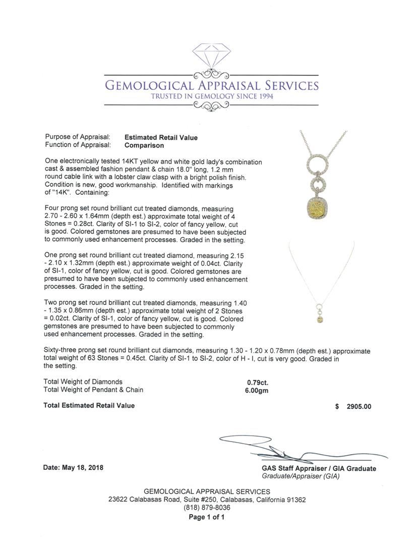 One electronically tested 14KT yellow and white gold lady's combination cast & assembled fashion pendant & chain 18.0' long, 1.2 mm round cable link with a lobster claw clasp with a bright polish finish. Identified with markings of '14K'. Condition is new, good workmanship. Containing: Four prong set round brilliant cut treated diamonds, measuring 2.70 - 2.60 x 1.64mm (depth est.) approximate total weight of 4 Stones = 0.28ct. Colored gemstones are presumed to have been subjected to commonly used enhancement processes. Graded in the setting. Color Fancy Yellow Clarity SI-1 to SI-2 Cut Good One prong set round brilliant cut treated diamond, measuring 2.15 - 2.10 x 1.32mm (depth est.) approximate weight of 0.04ct. Colored gemstones are presumed to have been subjected to commonly used enhancement processes. Graded in the setting. Color Fancy Yellow Clarity SI-1 Cut Good Two prong set round brilliant cut treated diamonds, measuring 1.40 - 1.35 x 0.86mm (depth est.) approximate total weight of 2 Stones = 0.02ct. Colored gemstones are presumed to have been subjected to commonly used enhancement processes. Graded in the setting. Color Fancy Yellow Clarity SI-1 Cut Good Sixty-Three prong set round brilliant cut diamonds, measuring 1.30 - 1.20 x 0.78mm (depth est.) approximate total weight of 63 Stones = 0.45ct. Graded in the setting. Color H - I Clarity SI-1 to SI-2 Cut Very Good. Total Weight of Diamonds 0.79ct.. Total Weight of Pendant & Chain 6.00gm GAS Appraised at $2905.00. GAS Appraised.