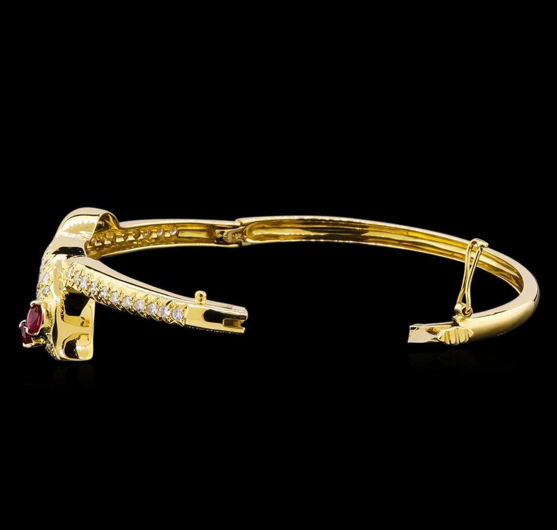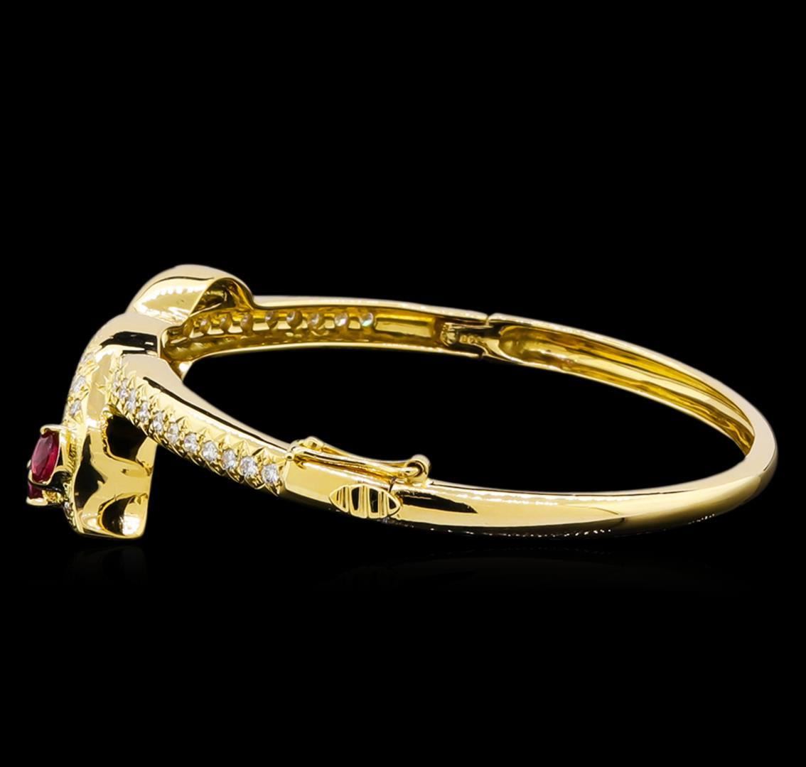 One electronically tested 18KT yellow gold ladies cast & assembled ruby and diamond bangle bracelet with a bright polish finish. Condition is new, good workmanship. Six inch wearable length bangle bracelet features a snake motif design. Two rubies accented the eyes of the snake. The head and body of the snake are encrusted with diamonds. The bangle bracelet is supported by hinged shoulders, terminating in a snap-locking clasp with safety. Bright polish finish. Identified with markings of "K18". Containing: Two prong set marquise mixed cut natural rubies, measuring 4.00 x 2.50 x 1.63mm, approximate total weight of 0.28ct., clarity is slightly included, type II, medium dark, very slightly brownish, slightly purplish red color, (GIA slpR 6/3), cut is good. Transmitting light with a minimum of distortion, transparent. Naturally occurring internal & external characteristics are present. Measurements & the color grade are an average for the pair. Graded in the setting. Forty-nine bead set round brilliant cut diamonds, measuring 1.70 - 1.50 x 0.96mm (depth est.) approximate total weight of 49 Stones = 0.83ct. Graded in the setting. Clarity: SI-2 to I-2. Color: F - H. Total Weight of Colored Stones: 0.28ct. Total Weight of Diamonds: 0.83ct. Total Weight of Bangle Bracelet 20.29 grams. AIG Appraised.