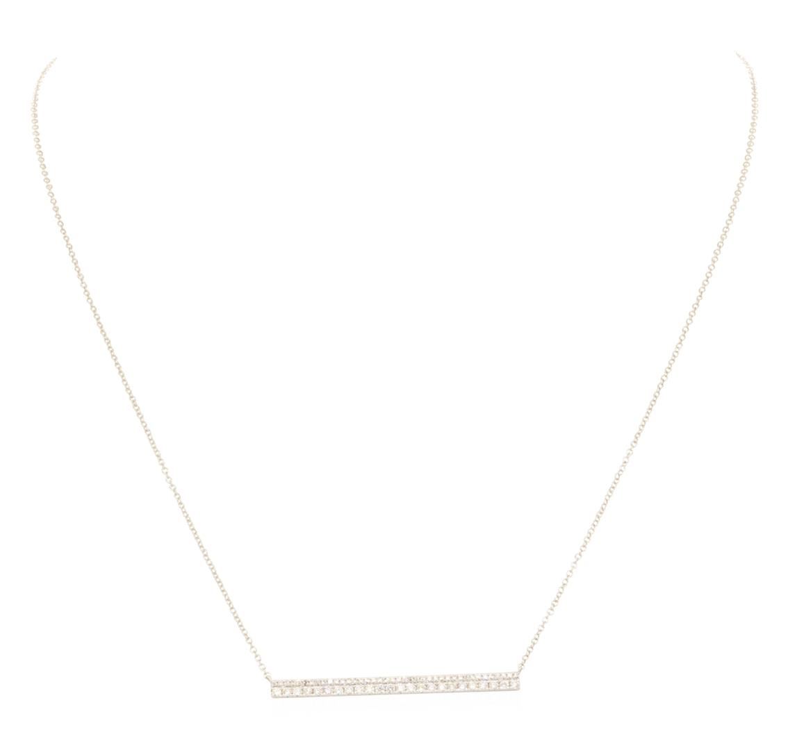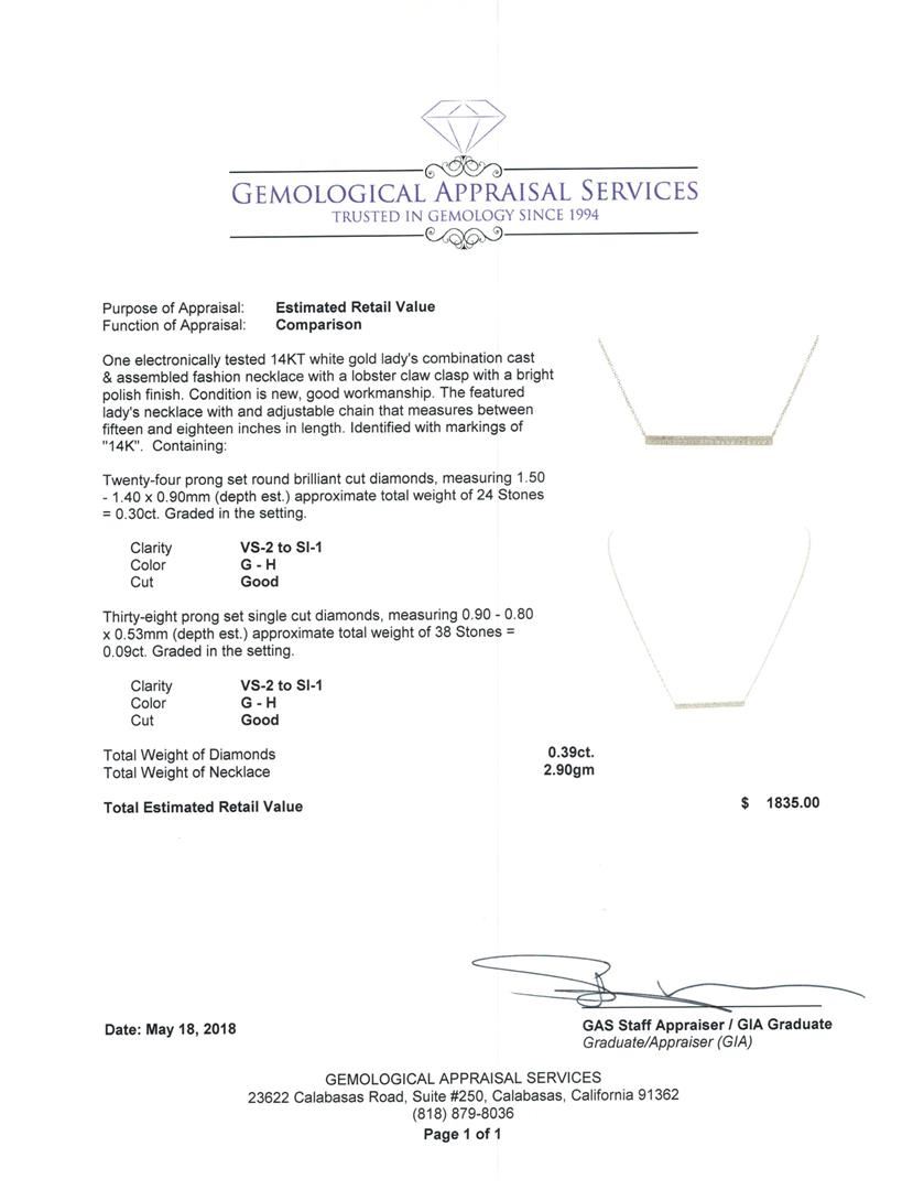 One electronically tested 14KT white gold lady's combination cast & assembled fashion necklace with a lobster claw clasp with a bright polish finish. The featured lady's necklace with and adjustable chain that measures between fifteen and eighteen inches in length. Identified with markings of '14K'. Condition is new, good workmanship. Containing: Twenty-Four prong set round brilliant cut diamonds, measuring 1.50 - 1.40 x 0.90mm (depth est.) approximate total weight of 24 Stones = 0.30ct. Graded in the setting. Color G - H Clarity VS-2 to SI-1 Cut Good Thirty-Eight prong set single cut diamonds, measuring 0.90 - 0.80 x 0.53mm (depth est.) approximate total weight of 38 Stones = 0.09ct. Graded in the setting. Color G - H Clarity VS-2 to SI-1 Cut Good. Total Weight of Diamonds 0.39ct.. Total Weight of Necklace 2.90gm GAS Appraised at $1835.00. GAS Appraised.