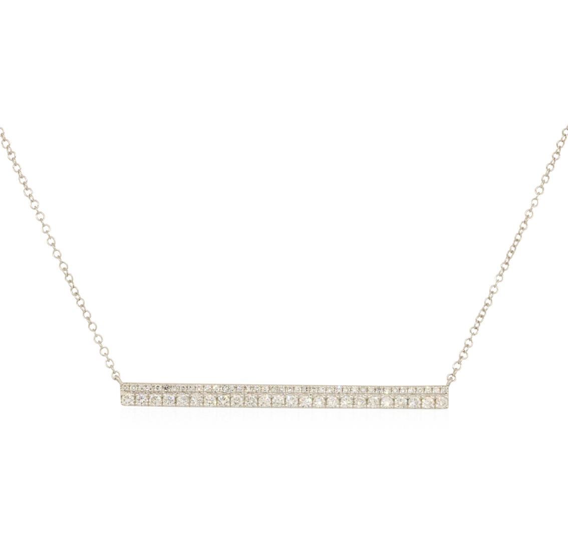 One electronically tested 14KT white gold lady's combination cast & assembled fashion necklace with a lobster claw clasp with a bright polish finish. The featured lady's necklace with and adjustable chain that measures between fifteen and eighteen inches in length. Identified with markings of '14K'. Condition is new, good workmanship. Containing: Twenty-Four prong set round brilliant cut diamonds, measuring 1.50 - 1.40 x 0.90mm (depth est.) approximate total weight of 24 Stones = 0.30ct. Graded in the setting. Color G - H Clarity VS-2 to SI-1 Cut Good Thirty-Eight prong set single cut diamonds, measuring 0.90 - 0.80 x 0.53mm (depth est.) approximate total weight of 38 Stones = 0.09ct. Graded in the setting. Color G - H Clarity VS-2 to SI-1 Cut Good. Total Weight of Diamonds 0.39ct.. Total Weight of Necklace 2.90gm GAS Appraised at $1835.00. GAS Appraised.