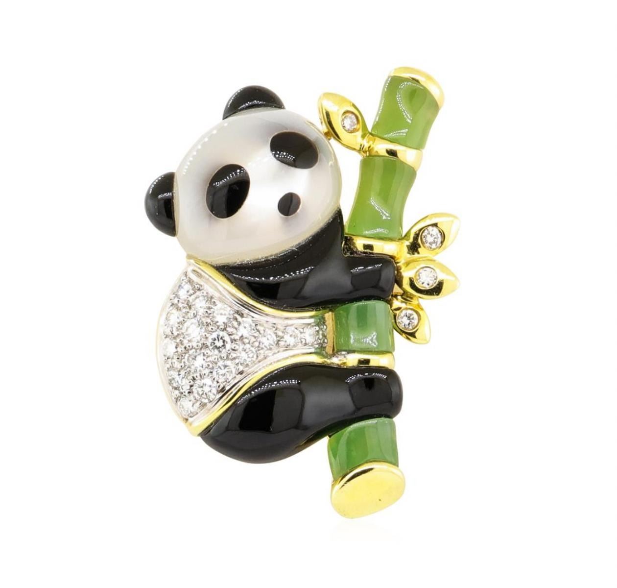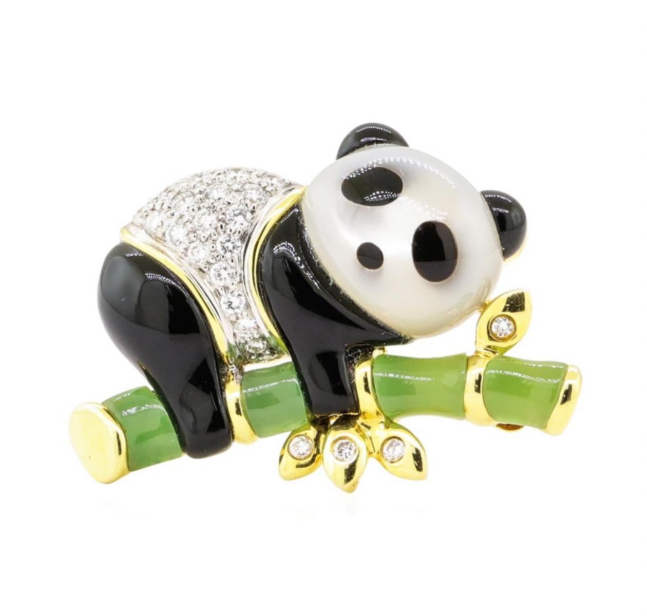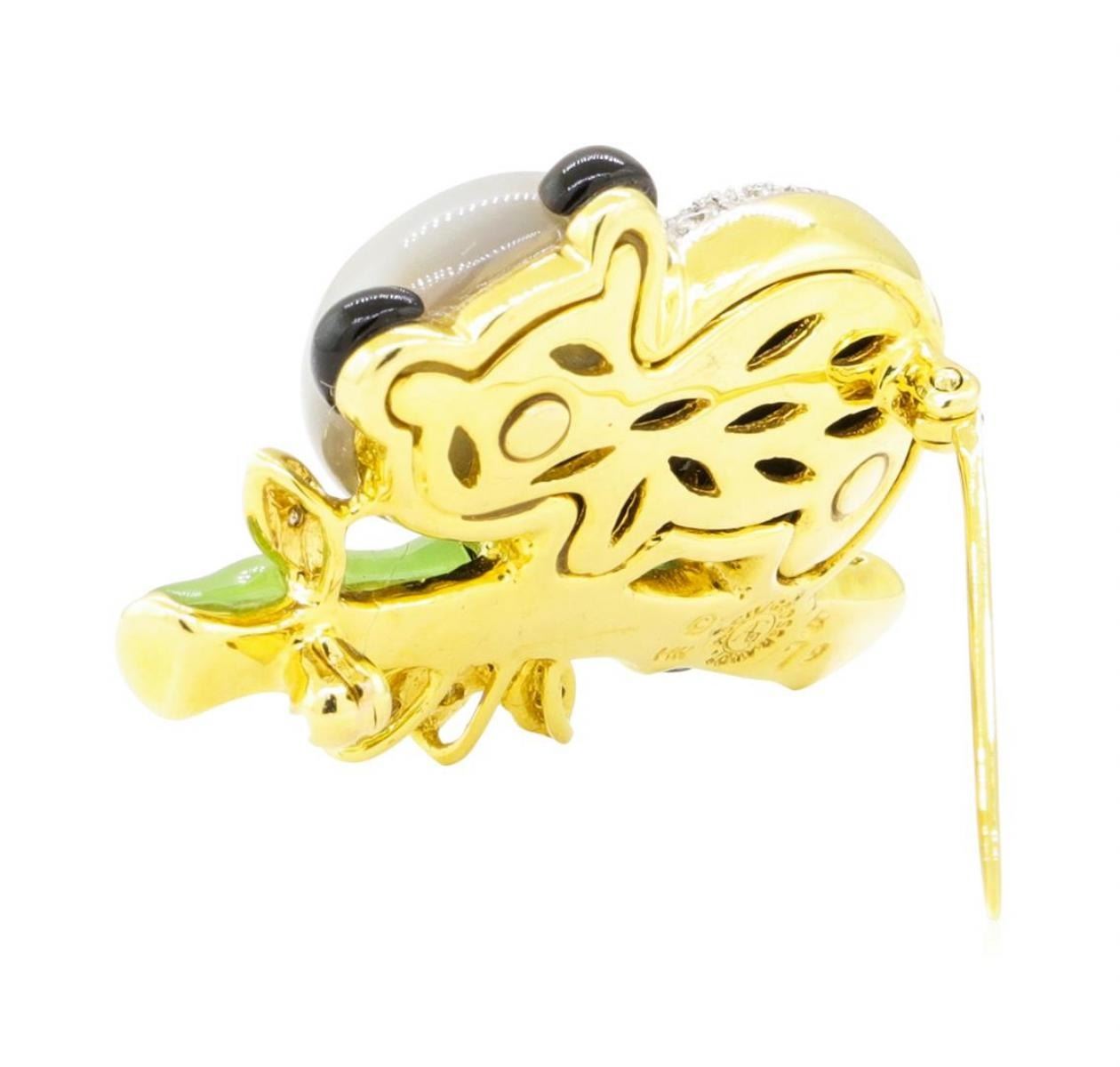 One electronically tested 14KT yellow gold lady's combination cast & assembled fashion panda pin with a bright polish finish. The featured panda pin contains inlaid pieces of mother of pearl, onyx, and jade. Trademark is Asch-Grossbardt. Identified with markings of '14K'. Condition is like new, good workmanship. Containing: Twenty-Two prong set round brilliant cut diamonds, measuring 1.70 - 1.50 x 0.99mm (depth est.) approximate total weight of 22 Stones = 0.30ct. Graded in the setting. Color F - G Clarity VS-1 to VS-2 Cut Very Good. Total Weight of Diamonds 0.30ct.. Total Weight of Pin 11.70gm GAS Appraised at $2150.00. GAS Appraised.
