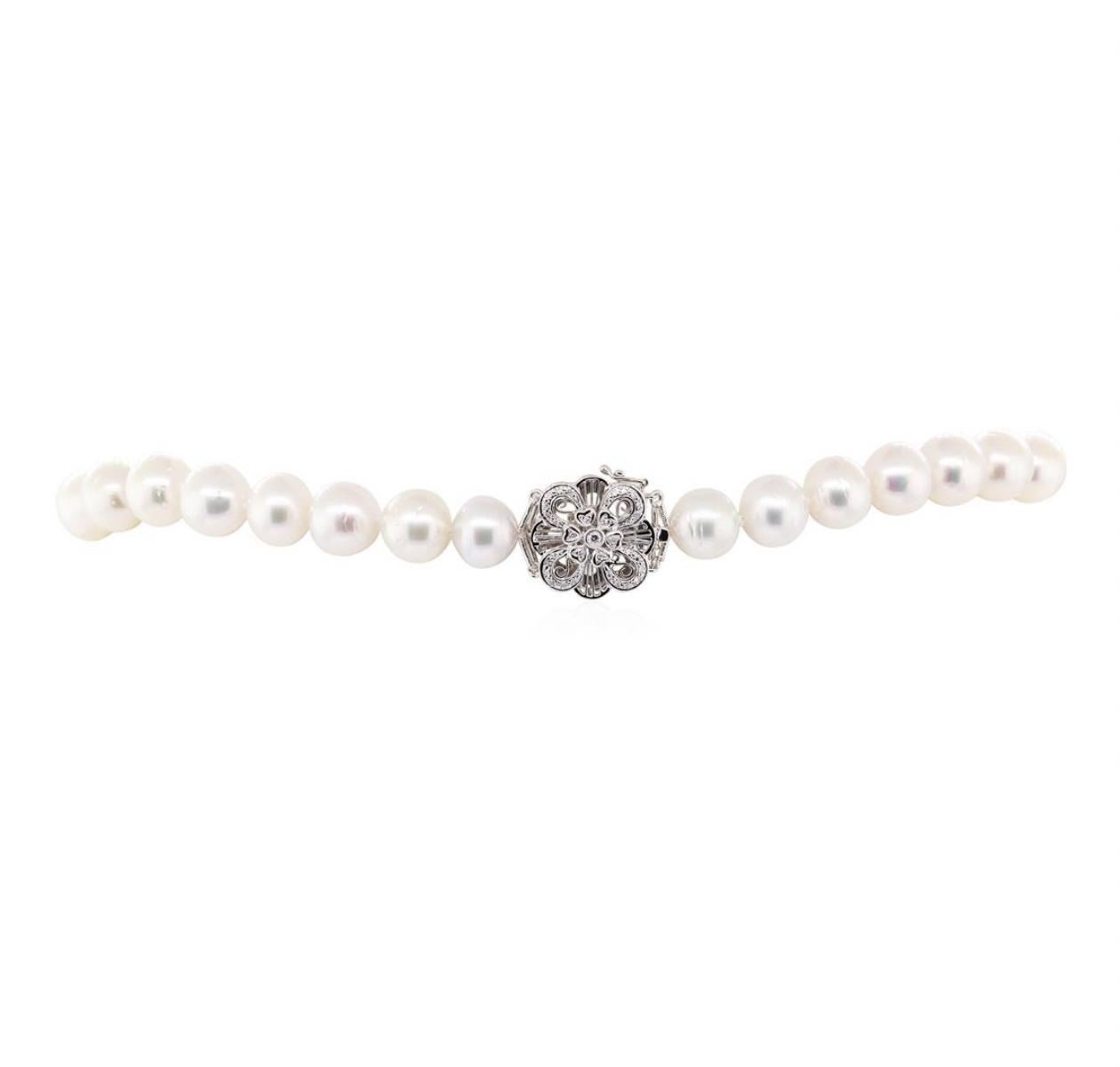One graduated single strand pearl necklace 18.0' princess length, knotted with a tongue clasp & foldover safety containing 37 south sea cultured pearls, 11.0mm to 14.3mm in size. The pearls are white in color with a good luster, round to near round, and moderately blemished with excellent matching. The featured pearl necklace has a 14KT white gold vintage clover motif clasp and rondels. Graded on the strand.South Sea cultured pearls are farmed in the oceans surrounding Australia, Indonesia, the Philippines and the southern coast of China. The main source of Australian South Sea pearls lies in the northwest on the Kimberly coast. South Sea cultured pearls are formed in the Pinctada Maxima oyster. These pearls take between two to three years to grow and have a unique nacre due to the fast moving and clean waters of the South Seas. One bezel set round brilliant cut diamond, measuring 2.30 - 2.25 x 1.41mm (depth est.) approximate weight of 0.05ct. Graded in the setting. Color G Clarity VS-2 Cut Very Good Sixty-Four prong set single cut diamonds, measuring 1.10 - 1.00 x 0.65mm (depth est.) approximate total weight of 64 Stones = 0.28ct. Graded in the setting. Color G - H Clarity VS-1 to SI-1 Cut Very Good. Total Weight of Diamonds 0.33ct.. Total Weight of 98.20gm GAS Appraised at $19855.00. GAS Appraised.