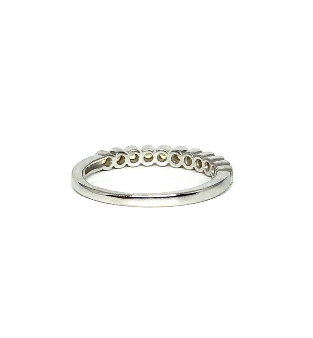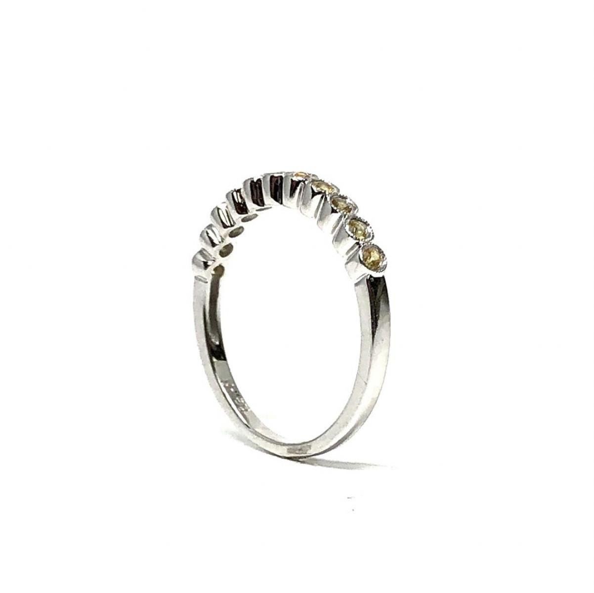 One electronically tested 18KT white gold lady's cast fashion ring with a bright polish with milgrain detailing finish. The featured lady's ring has a shank measuring 1.50 millimeters in width. Identified with markings of '18K 750'. Condition is like new, good workmanship. Containing: Eleven bezel set round brilliant cut natural yellow sapphires, measuring 1.70 - 1.65 x 1.09 mm, (depth est.) approximate total weight of 0.33ct., clarity is eye clean, medium, moderately strong, orangy yellow color, (GIA oY 5/4), cut is very good. Transmitting light with a minimum of distortion, transparent. Colored gemstones are presumed to have been subjected to commonly used enhancement processes. Graded in the setting. Total Weight of Colored Stones 0.33ct.. Total Weight of Ring 2.20gm GAS Appraised at $850.00.