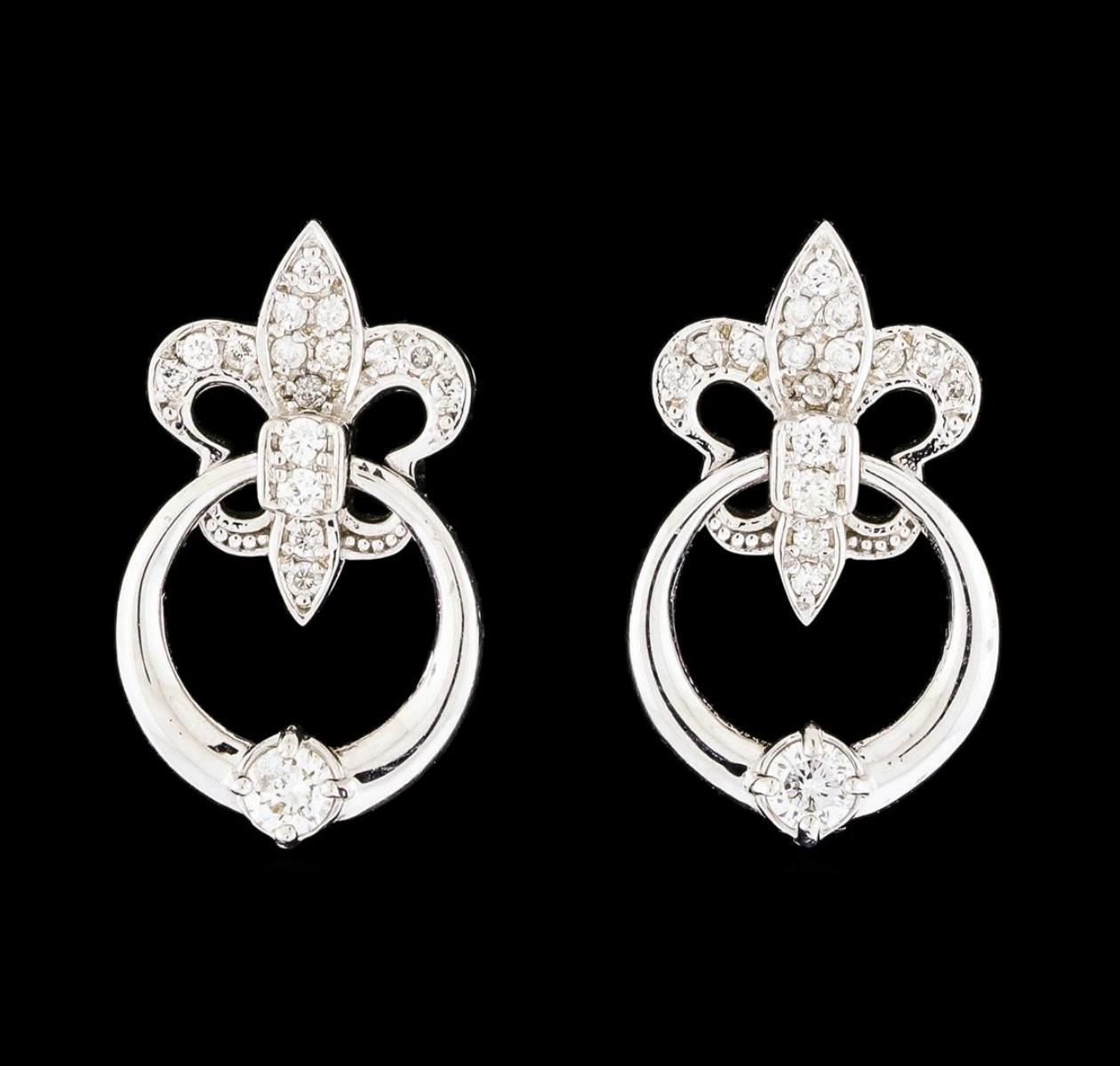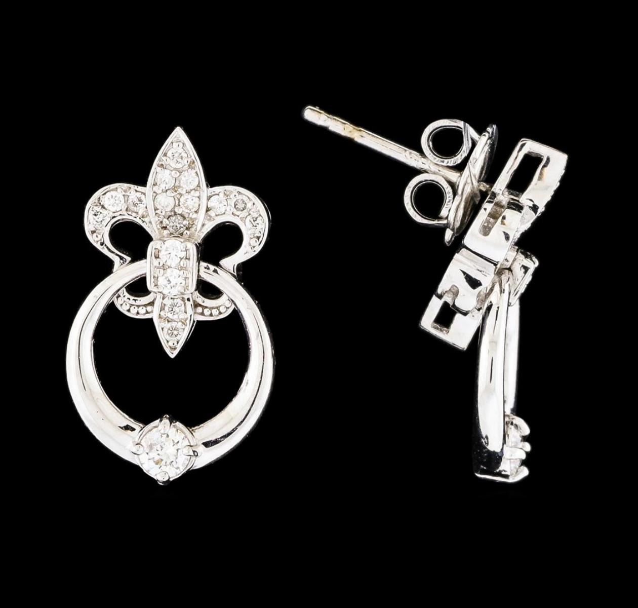 One pair of Diamond Earrings featuring: 14KT White Gold with a total weight of 4.54 grams, 32 Diamonds with a total weight of 0.19ctw, and 2 Diamonds with a total weight of 0.15ctw.