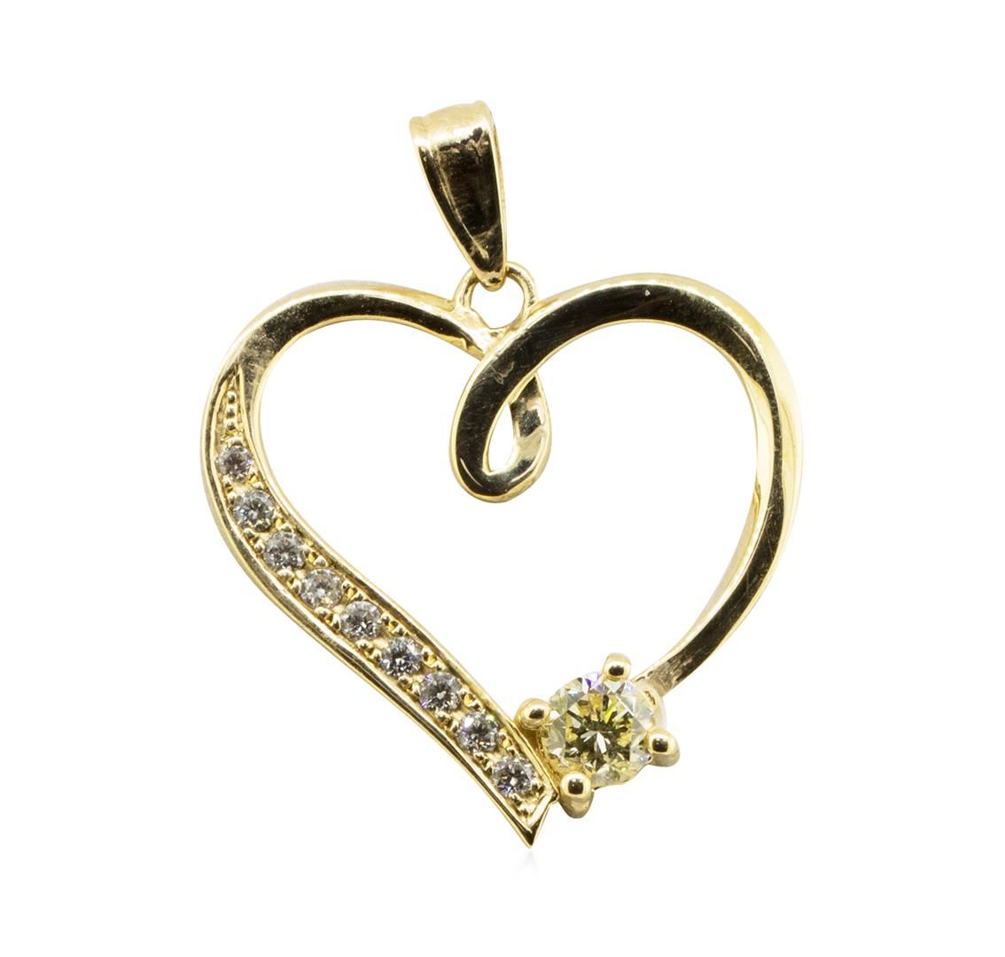 One heart shaped pendant featuring: 14KT yellow gold weighing 2.2 grams containing diamonds weighing 0.37ctw.