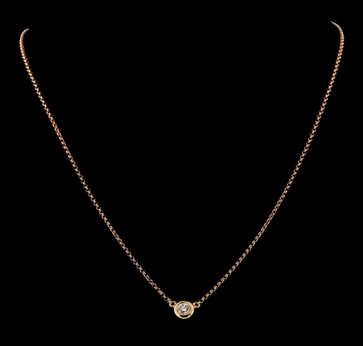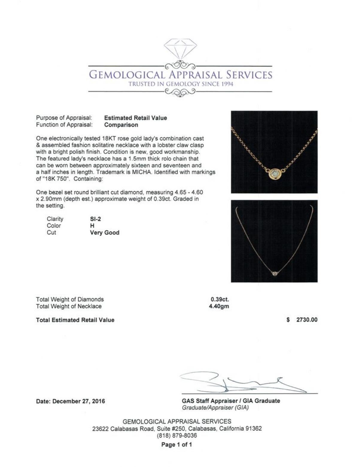 One electronically tested 18KT rose gold lady's combination cast & assembled fashion solitaire necklace with a lobster claw clasp with a bright polish finish. The featured lady's necklace has a 1.5mm thick rolo chain that can be worn between approximately sixteen and seventeen and a half inches in length. Trademark is MICHA. Identified with markings of '18K 750'. Condition is new, good workmanship. Containing: One bezel set round brilliant cut diamond, measuring 4.65 - 4.60 x 2.90mm (depth est.) approximate weight of 0.39ct. Graded in the setting. Clarity SI-2. Color: H Cut Very Good. Total Weight of Diamonds 0.39ct.. Total Weight of Necklace 4.40gm. GAS Appraised at $2,730.00.