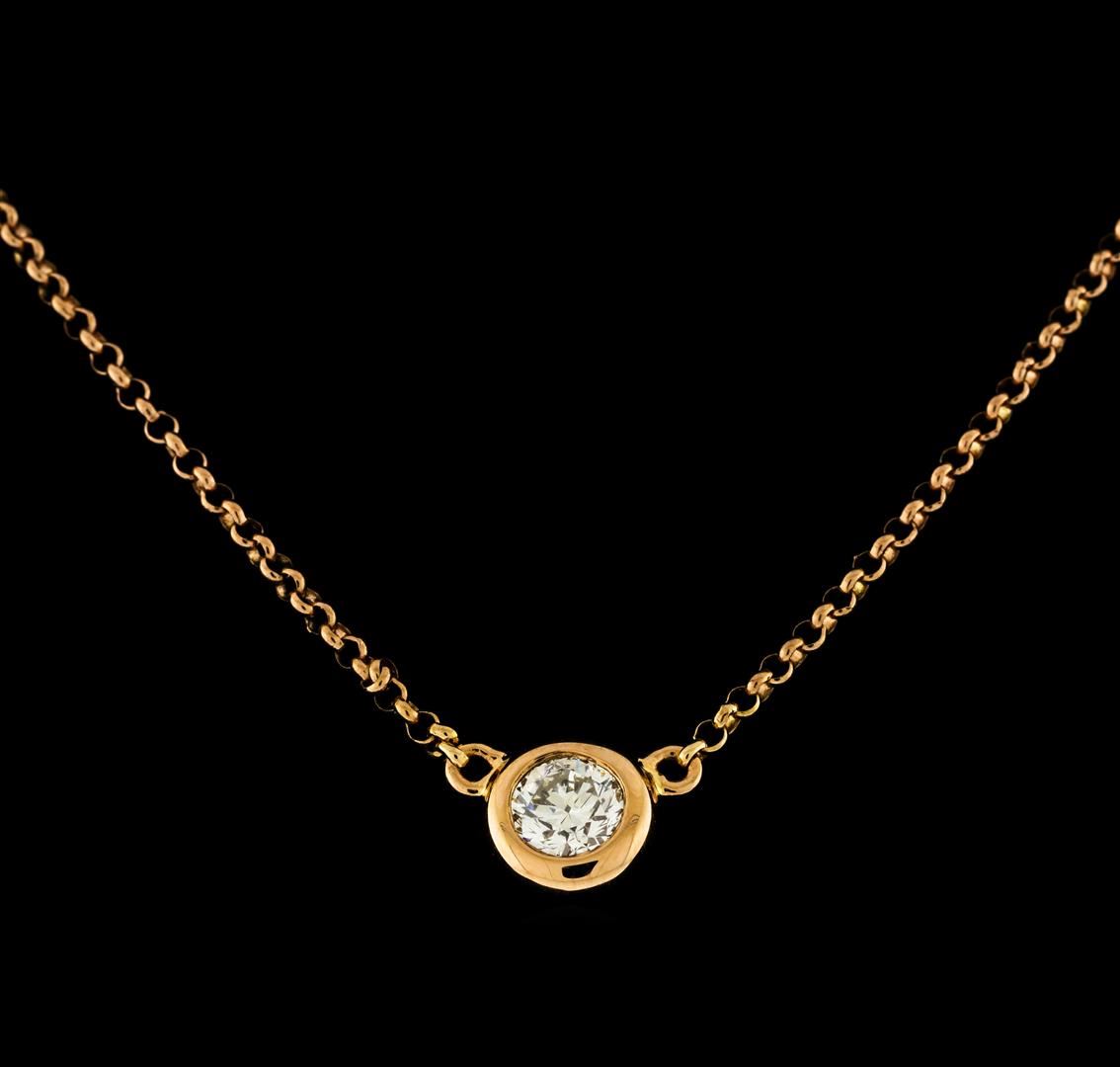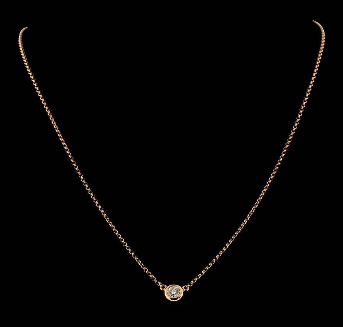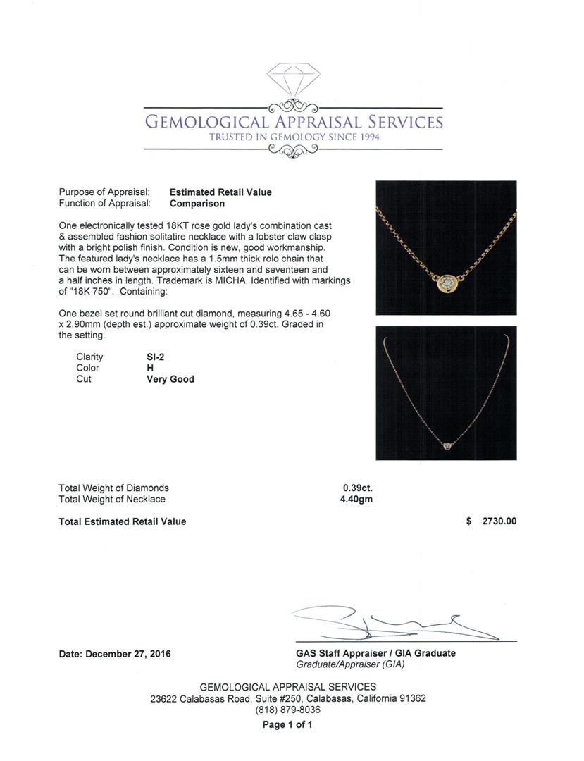 One electronically tested 18KT rose gold lady's combination cast & assembled fashion solitaire necklace with a lobster claw clasp with a bright polish finish. The featured lady's necklace has a 1.5mm thick rolo chain that can be worn between approximately sixteen and seventeen and a half inches in length. Trademark is MICHA. Identified with markings of '18K 750'. Condition is new, good workmanship. Containing: One bezel set round brilliant cut diamond, measuring 4.65 - 4.60 x 2.90mm (depth est.) approximate weight of 0.39ct. Graded in the setting. Clarity SI-2. Color: H Cut Very Good. Total Weight of Diamonds 0.39ct.. Total Weight of Necklace 4.40gm. GAS Appraised.