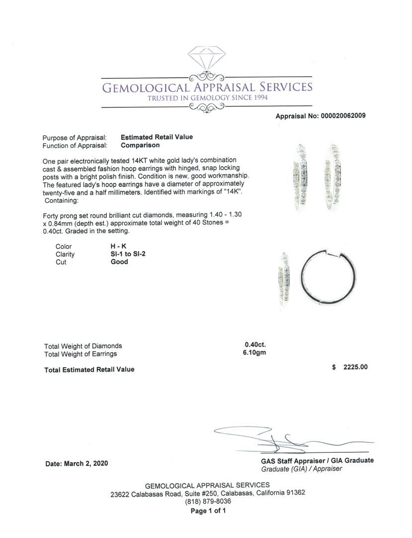 One pair electronically tested 14KT white gold lady's combination cast & assembled fashion hoop earrings with hinged, snap locking posts with a bright polish finish. The featured lady's hoop earrings have a diameter of approximately twenty-five and a half millimeters. Identified with markings of '14K'. Condition is new, good workmanship. Containing: Forty prong set round brilliant cut diamonds, measuring 1.40 - 1.30 x 0.84mm (depth est.) approximate total weight of 40 Stones = 0.40ct. Graded in the setting. Color H - K Clarity SI-1 to SI-2 Cut Good. Total Weight of Diamonds 0.40ct.. Total Weight of Earrings 6.10gm GAS Appraised at $2225.00. GAS Appraised.