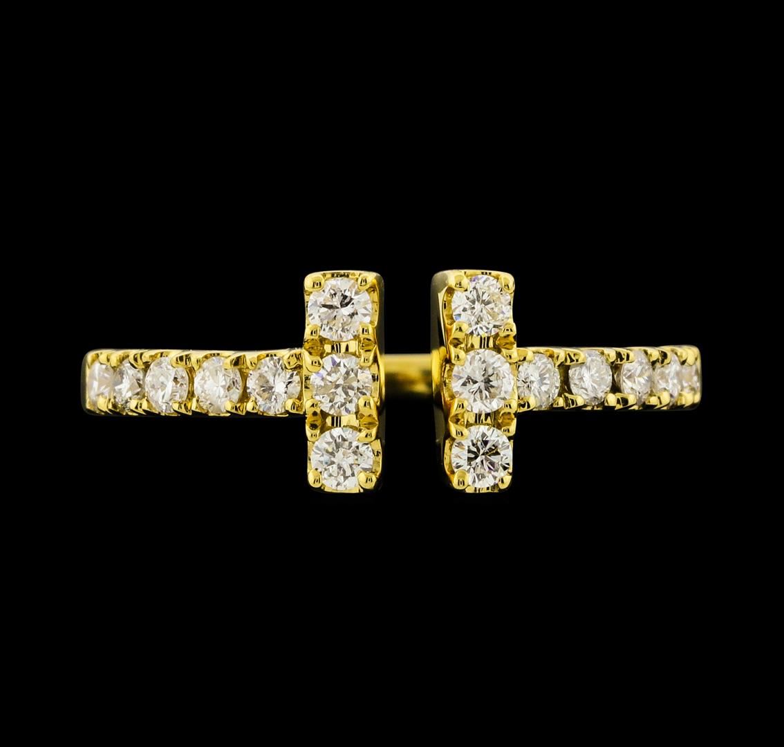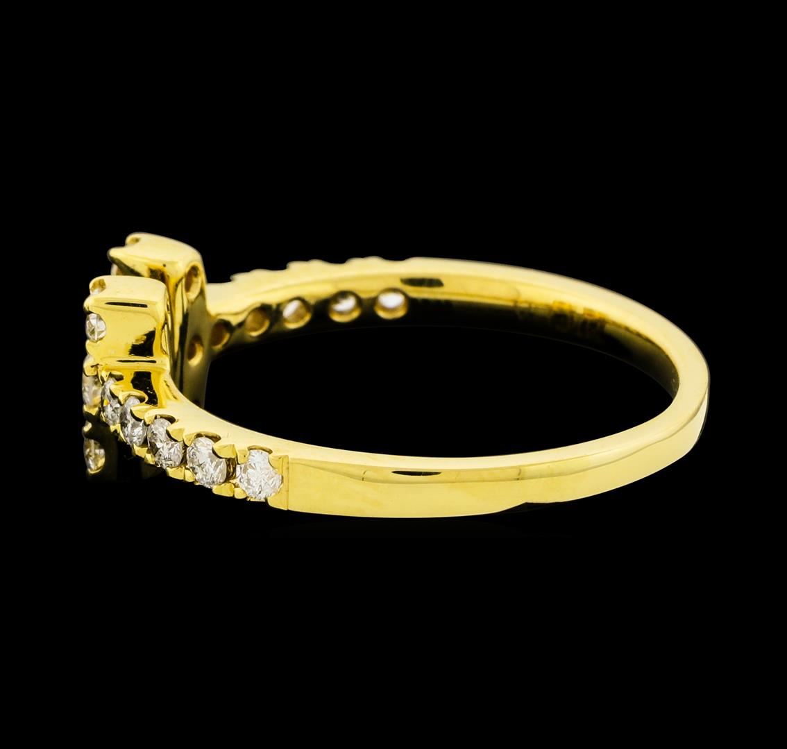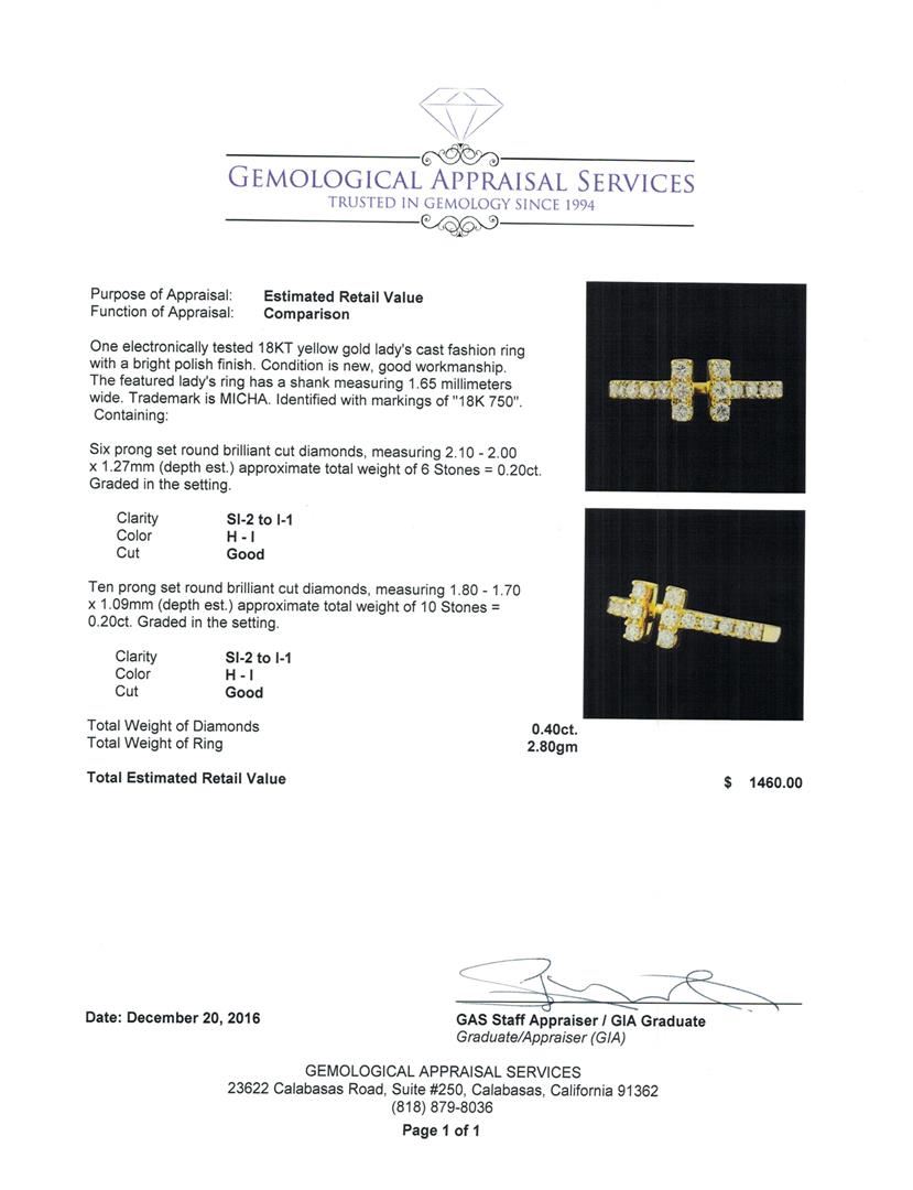 One electronically tested 18KT yellow gold lady's cast fashion ring with a bright polish finish. The featured lady's ring has a shank measuring 1.65 millimeters wide. Trademark is MICHA. Identified with markings of '18K 750'. Condition is new, good workmanship. Containing: Six prong set round brilliant cut diamonds, measuring 2.10 - 2.00 x 1.27mm (depth est.) approximate total weight of 6 Stones = 0.20ct. Graded in the setting. Clarity SI-2 to I-1. Color: H - I Cut Good Ten prong set round brilliant cut diamonds, measuring 1.80 - 1.70 x 1.09mm (depth est.) approximate total weight of 10 Stones = 0.20ct. Graded in the setting. Clarity SI-2 to I-1. Color: H - I Cut Good. Total Weight of Diamonds 0.40ct.. Total Weight of Ring 2.80gm. GAS Appraised.