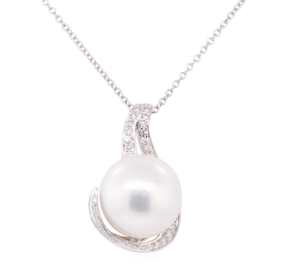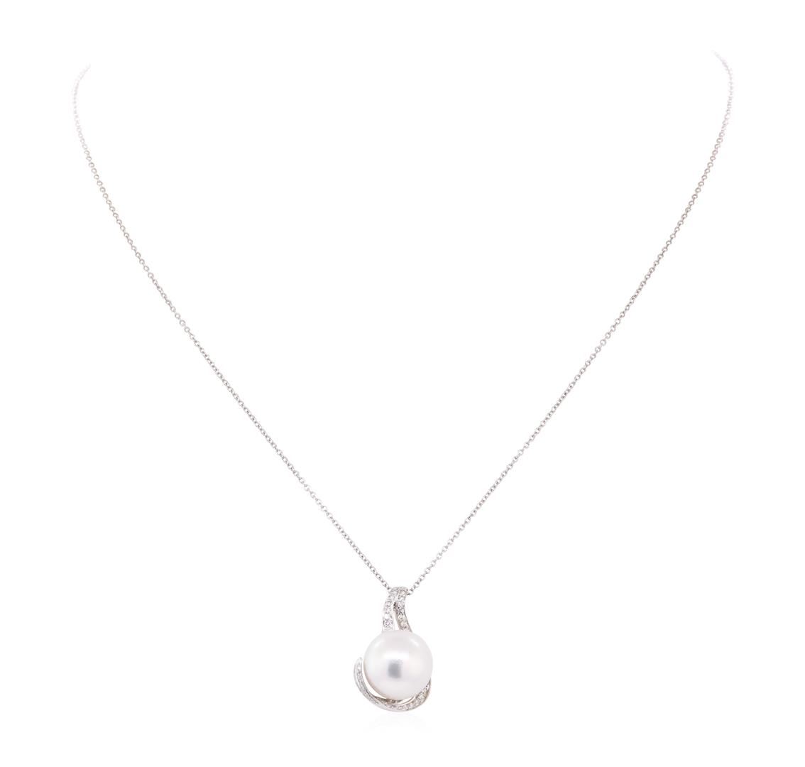 One pendant with chain featuring: 14KT white gold weighing 4.5 grams containing diamonds weighing 0.40ctw and one south sea cultured pearl measuring 11.5mm. The pendant has an attached sixteen inch long 1mm rounded cable link chain.