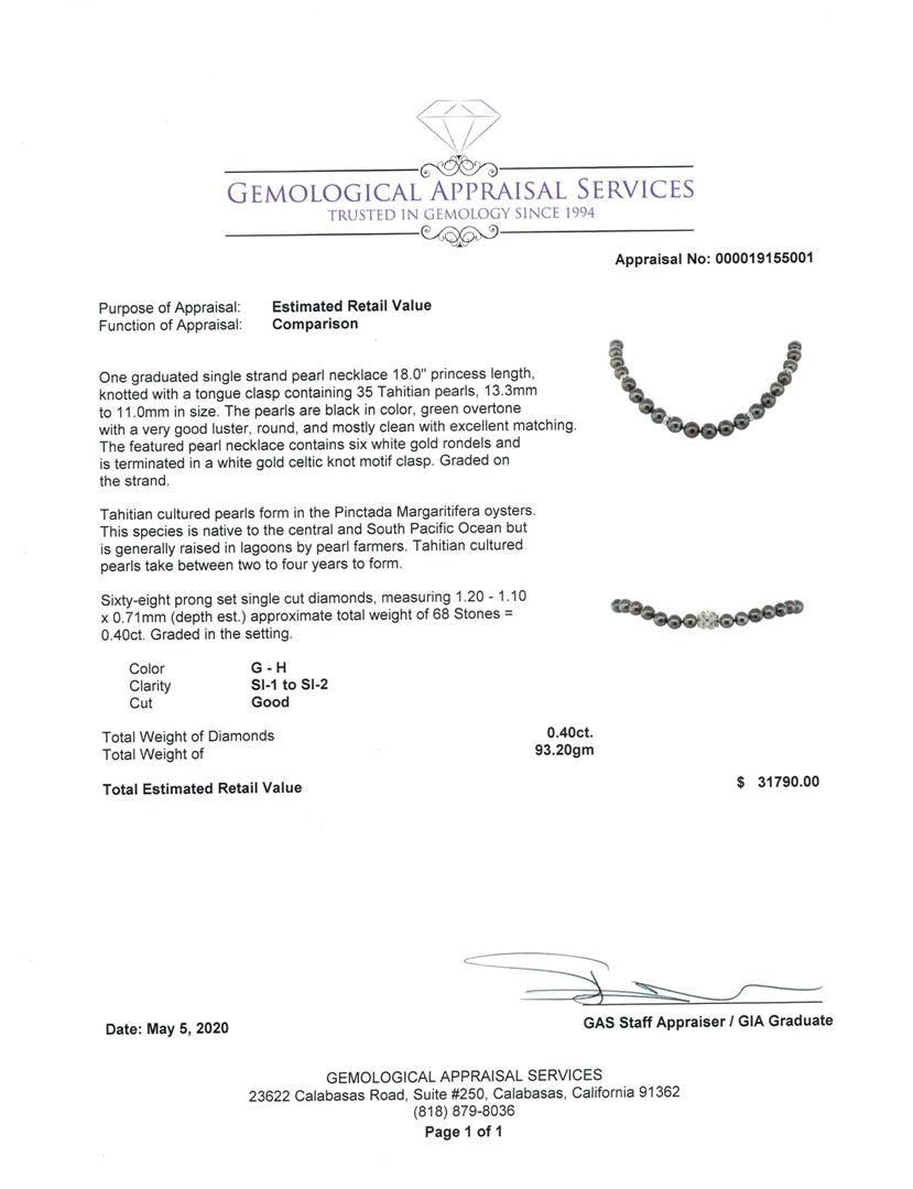 One graduated single strand pearl necklace 18.0' princess length, knotted with a tongue clasp containing 35 Tahitian pearls, 13.3mm to 11.0mm in size. The pearls are black in color, green overtone with a very good luster, round, and mostly clean with excellent matching. The featured pearl necklace contains six white gold rondels and is terminated in a white gold celtic knot motif clasp. Graded on the strand.Tahitian cultured pearls form in the Pinctada Margaritifera oysters. This species is native to the central and South Pacific Ocean but is generally raised in lagoons by pearl farmers. Tahitian cultured pearls take between two to four years to form. Sixty-Eight prong set single cut diamonds, measuring 1.20 - 1.10 x 0.71mm (depth est.) approximate total weight of 68 Stones = 0.40 ct. Graded in the setting. Color G - H Clarity SI-1 to SI-2 Cut Good. Total Weight of Diamonds 0.40 ct.. Total Weight of 93.20gm GAS Appraised at $31790.00. GAS Appraised.