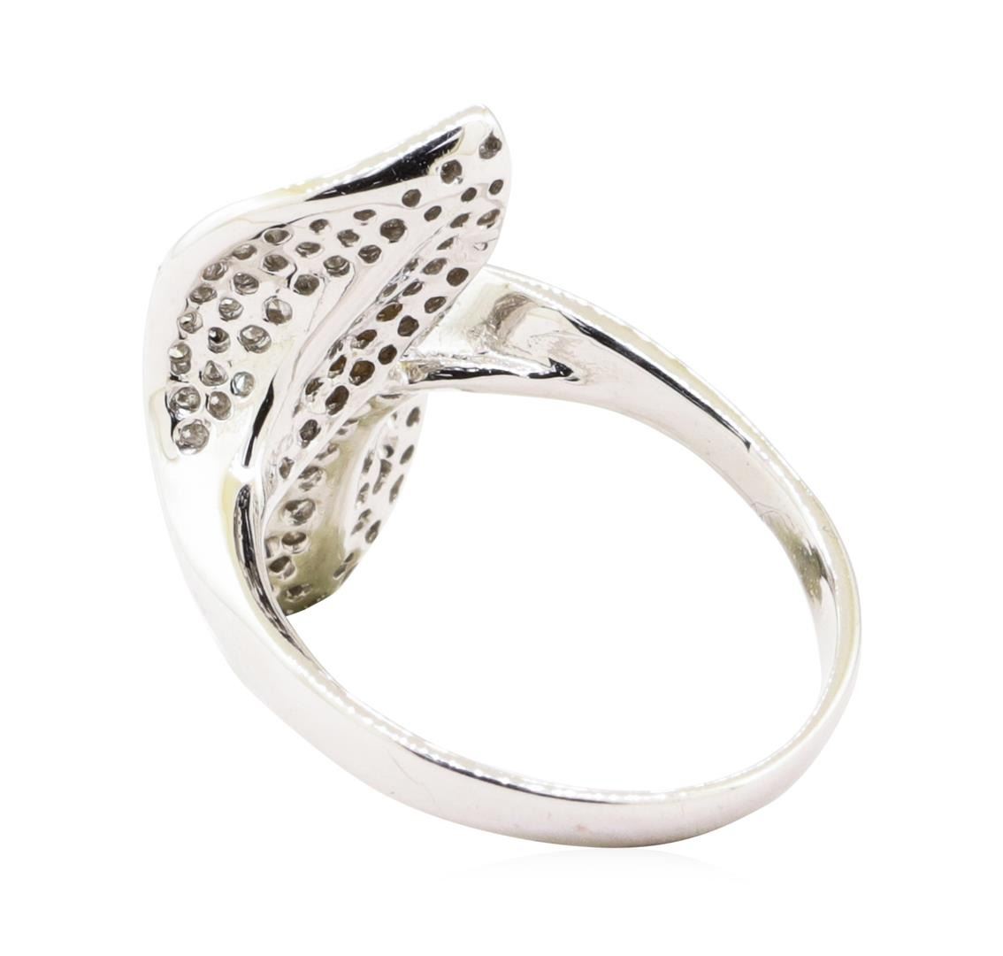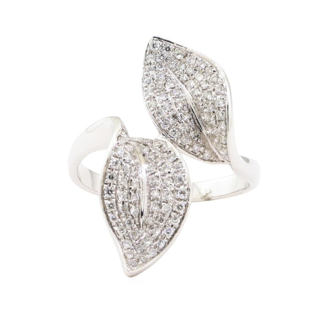 One electronically tested 18KT white gold lady's cast fashion ring with a dual leaf motif with a bright polish finish. The featured lady's ring has a shank measuring 2.00 millimeters wide. Identified with markings of '750'. Condition is new, good workmanship. Containing: One Hundred Eleven prong set round brilliant cut diamonds, measuring 1.10 - 1.00 x 0.63mm (depth est.) approximate total weight of 111 Stones = 0.42ct. Graded in the setting. Color G - H Clarity SI-1 to SI-2 Cut Very Good. Total Weight of Diamonds 0.42ct.. Total Weight of Ring 5.00gm GAS Appraised at $2550.00. GAS Appraised.