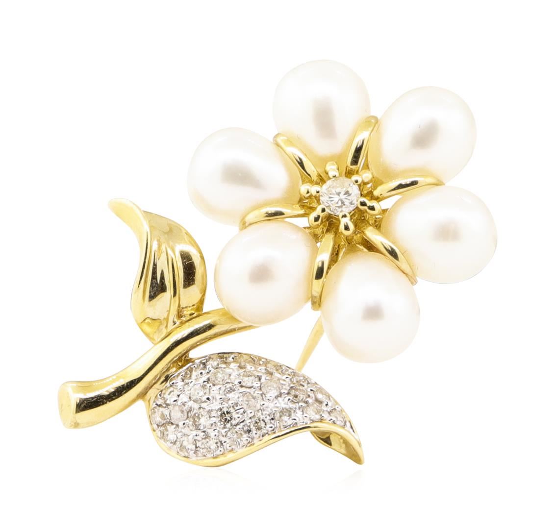 One electronically tested 14KT yellow gold lady's combination cast & assembled fashion floral design pin with a bright polish finish. The featured pin has a length of approximately thirty-six millimeters. Identified with markings of '14K'. Condition is new, good workmanship. Containing: Six chinese freshwater pearls, 8.6mm to 7.0mm in size. The pearls are white in color with a good luster, off round, and mostly clean with very good matching. Graded in the setting. One prong set round brilliant cut diamond, measuring 2.90 - 2.85 x 1.79mm (depth est.) approximate weight of 0.09ct. Graded in the setting. Color I Clarity I-1 Cut Good Twenty-Six prong set round brilliant cut diamonds, measuring 1.55 - 1.50 x 0.95mm (depth est.) approximate total weight of 26 Stones = 0.35ct. Graded in the setting. Color H - I Clarity SI-1 to I-1 Cut Good. Total Weight of Diamonds 0.44ct.. Total Weight of Pin 7.40gm GAS Appraised at $2820.00. GAS Appraised.