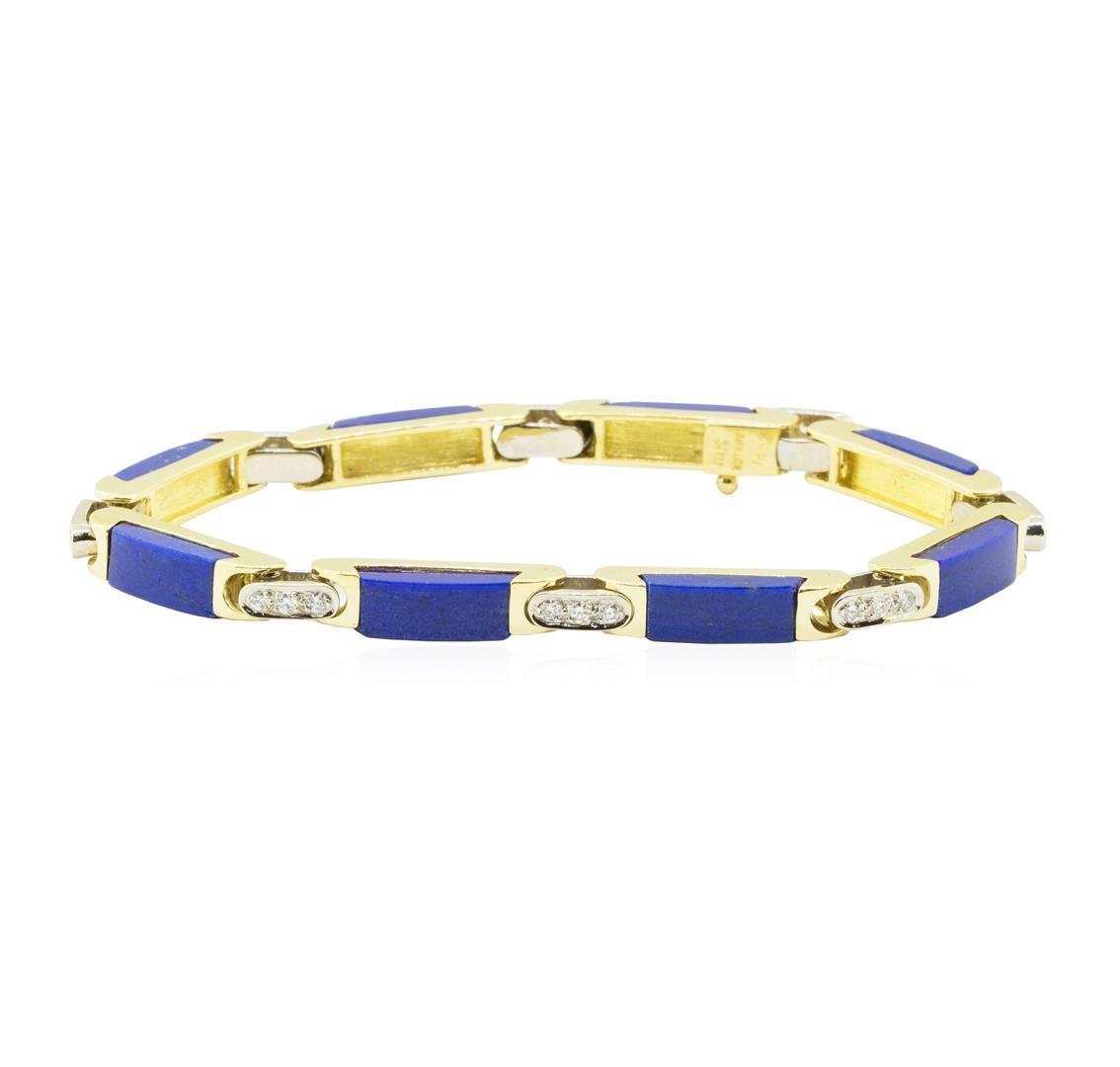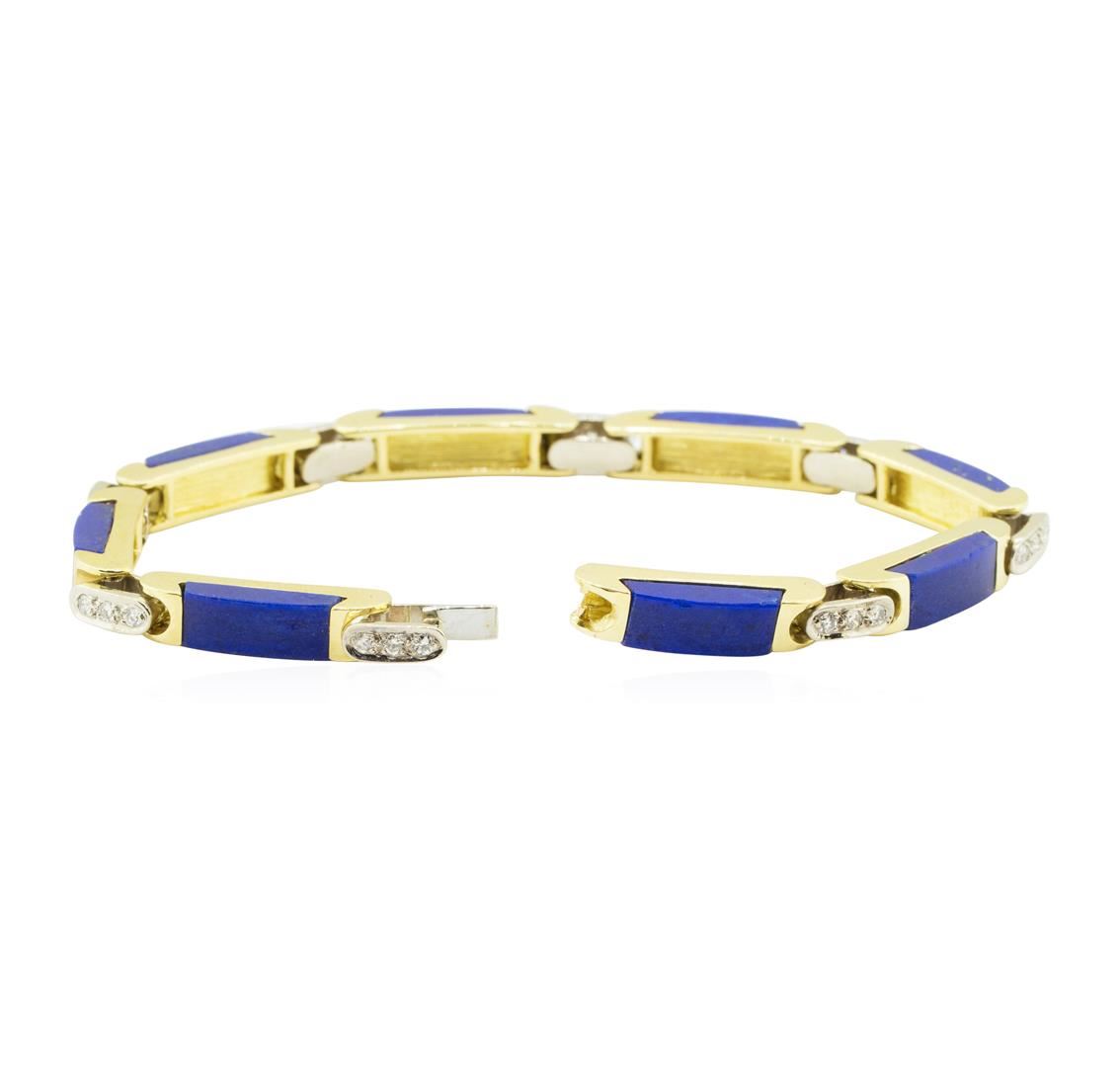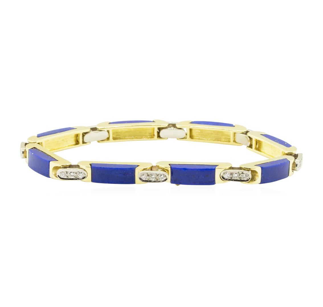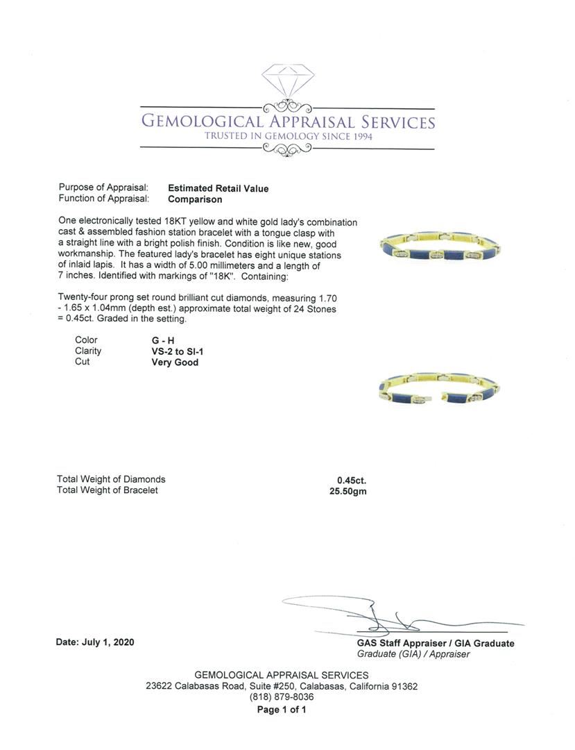 One electronically tested 18KT yellow and white gold lady's combination cast & assembled fashion station bracelet with a tongue clasp with a straight line with a bright polish finish. The featured lady's bracelet has eight unique stations of inlaid lapis. It has a width of 5.00 millimeters and a length of 7 inches. Identified with markings of '18K'. Condition is like new, good workmanship. Containing: Twenty-Four prong set round brilliant cut diamonds, measuring 1.70 - 1.65 x 1.04mm (depth est.) approximate total weight of 24 Stones = 0.45ct. Graded in the setting. Color G - H Clarity VS-2 to SI-1 Cut Very Good. Total Weight of Diamonds 0.45ct.. Total Weight of Bracelet 25.50gm GAS Appraised at $6450.00. GAS Appraised.