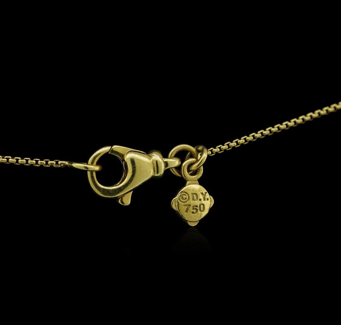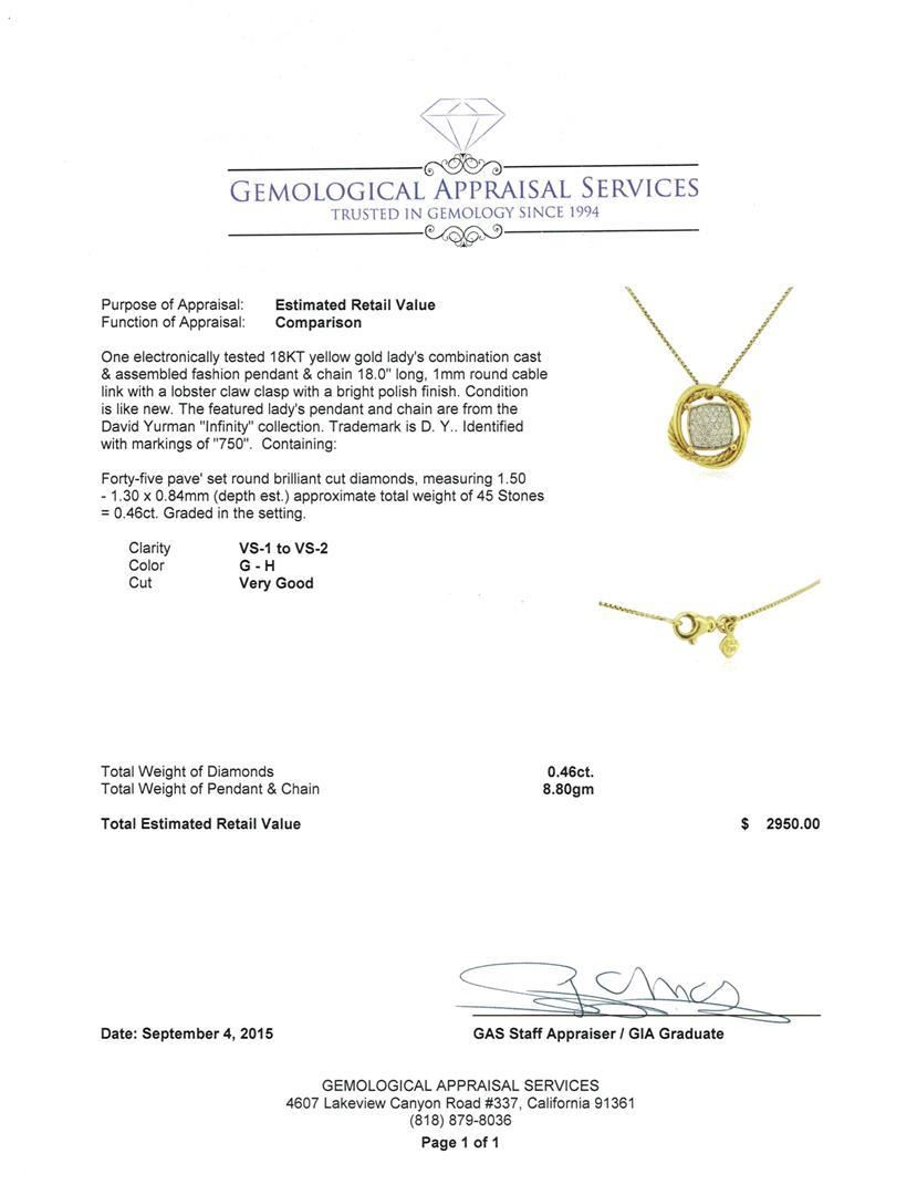 One electronically tested 18KT yellow gold lady's combination cast & assembled fashion pendant & chain 18.0" long, 1mm round cable link with a lobster claw clasp with a bright polish finish. The featured lady's pendant and chain are from the David Yurman "Infinity" collection. Trademark is D. Y. Identified with markings of "750". Condition is like new. Containing: Forty-Five pave' set round brilliant cut diamonds, measuring 1.50 - 1.30 x 0.84mm (depth est.) approximate total weight of 45 Stones = 0.46ct. Graded in the setting. Clarity: VS-1 to VS-2. Color: G - Very Good. Total Weight of Diamonds 0.46ct. Total Weight of Pendant & Chain 8.80gm. GAS Appraised.