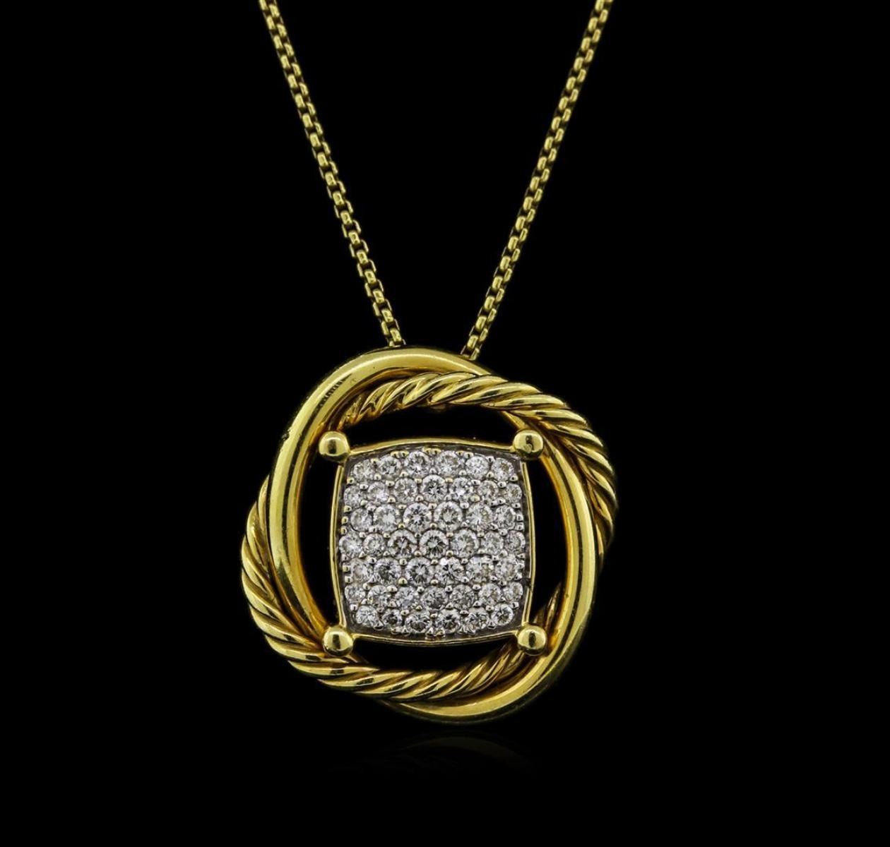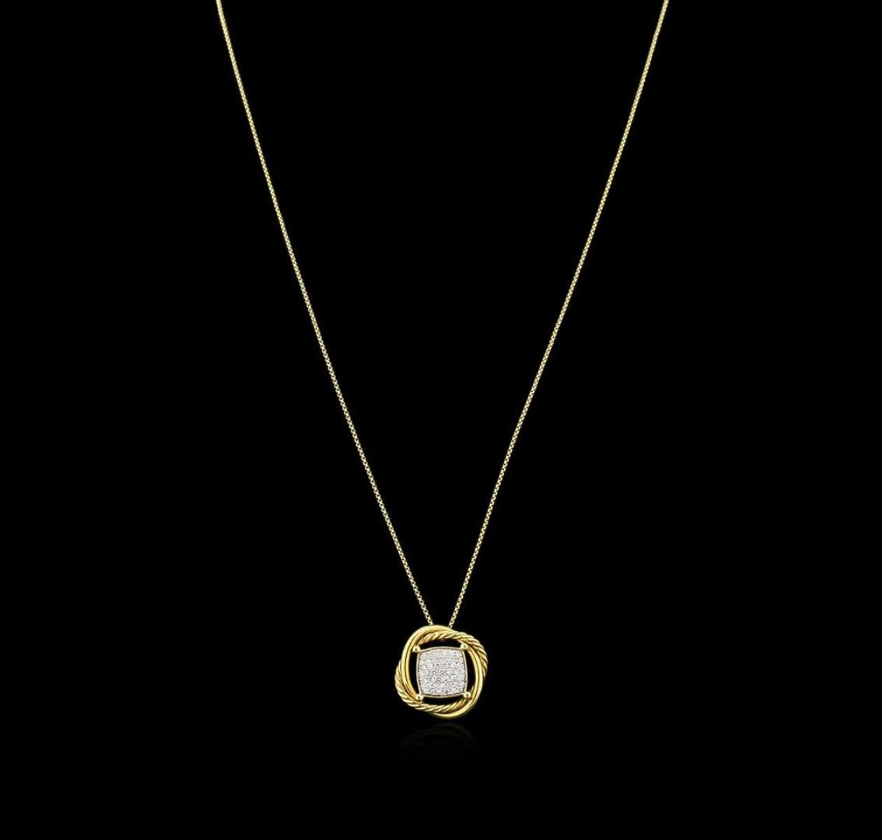 One electronically tested 18KT yellow gold lady's combination cast & assembled fashion pendant & chain 18.0" long, 1mm round cable link with a lobster claw clasp with a bright polish finish. The featured lady's pendant and chain are from the David Yurman "Infinity" collection. Trademark is D. Y. Identified with markings of "750". Condition is like new. Containing: Forty-Five pave' set round brilliant cut diamonds, measuring 1.50 - 1.30 x 0.84mm (depth est.) approximate total weight of 45 Stones = 0.46ct. Graded in the setting. Clarity: VS-1 to VS-2. Color: G - Very Good. Total Weight of Diamonds 0.46ct. Total Weight of Pendant & Chain 8.80gm. GAS Appraised.