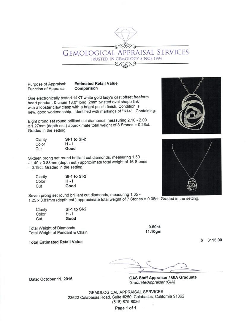 One electronically tested 14KT white gold lady's cast offset freeform heart pendant & chain 18.0' long, 2mm twisted oval shape link with a lobster claw clasp with a bright polish finish. Identified with markings of 'K14'. Condition is new, good workmanship. Containing: Eight prong set round brilliant cut diamonds, measuring 2.10 - 2.00 x 1.27mm (depth est.) approximate total weight of 8 Stones = 0.26ct. Graded in the setting. Clarity SI-1 to SI-2. Color: H - I Cut Good Sixteen prong set round brilliant cut diamonds, measuring 1.50 - 1.40 x 0.88mm (depth est.) approximate total weight of 16 Stones = 0.18ct. Graded in the setting. Clarity SI-1 to SI-2. Color: H - I Cut Good Seven prong set round brilliant cut diamonds, measuring 1.35 - 1.25 x 0.81mm (depth est.) approximate total weight of 7 Stones = 0.06ct. Graded in the setting. Clarity SI-1 to SI-2. Color: H - I Cut Good. Total Weight of Diamonds 0.50ct.. Total Weight of Pendant & Chain 11.10gm. GAS Appraised.