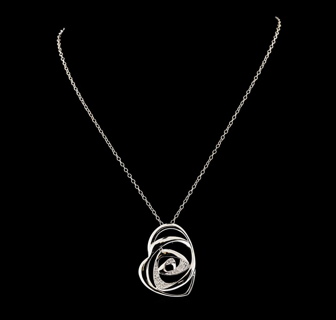 One electronically tested 14KT white gold lady's cast offset freeform heart pendant & chain 18.0' long, 2mm twisted oval shape link with a lobster claw clasp with a bright polish finish. Identified with markings of 'K14'. Condition is new, good workmanship. Containing: Eight prong set round brilliant cut diamonds, measuring 2.10 - 2.00 x 1.27mm (depth est.) approximate total weight of 8 Stones = 0.26ct. Graded in the setting. Clarity SI-1 to SI-2. Color: H - I Cut Good Sixteen prong set round brilliant cut diamonds, measuring 1.50 - 1.40 x 0.88mm (depth est.) approximate total weight of 16 Stones = 0.18ct. Graded in the setting. Clarity SI-1 to SI-2. Color: H - I Cut Good Seven prong set round brilliant cut diamonds, measuring 1.35 - 1.25 x 0.81mm (depth est.) approximate total weight of 7 Stones = 0.06ct. Graded in the setting. Clarity SI-1 to SI-2. Color: H - I Cut Good. Total Weight of Diamonds 0.50ct.. Total Weight of Pendant & Chain 11.10gm. GAS Appraised.