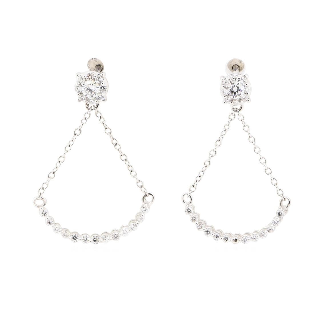One pair of diamond dangle crescent earrings with a drop of approximately 25 mm featuring: 10KT white gold weighing 1.8 grams containing diamonds weighing 0.51ctw.