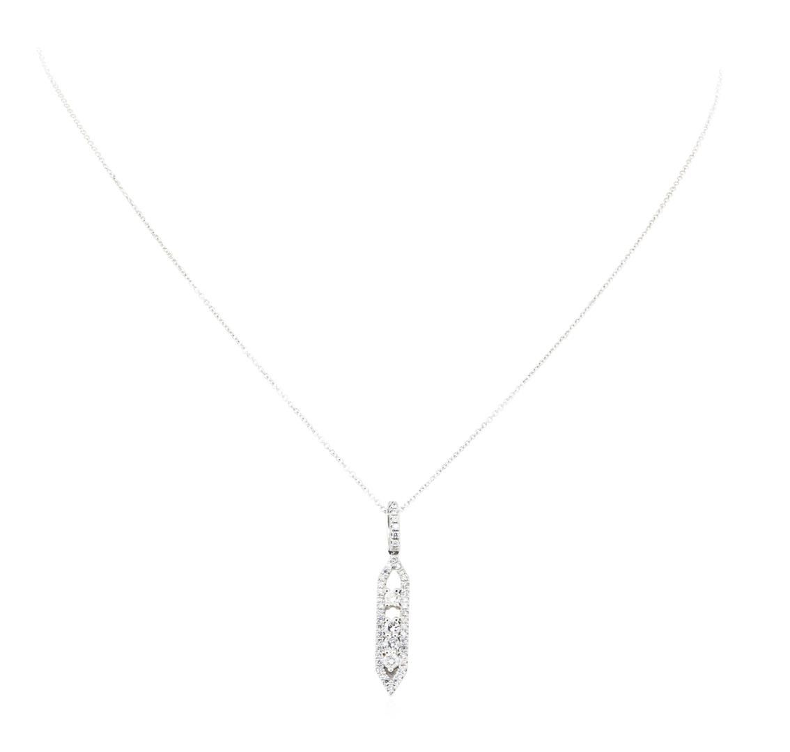 One icicle shaped pendant with an attached chain featuring: 14KT white gold weighing 2.6 grams containing diamonds weighing 0.51ctw. The chain is a 1mm rounded cable link chain measuring sixteen inches in length.