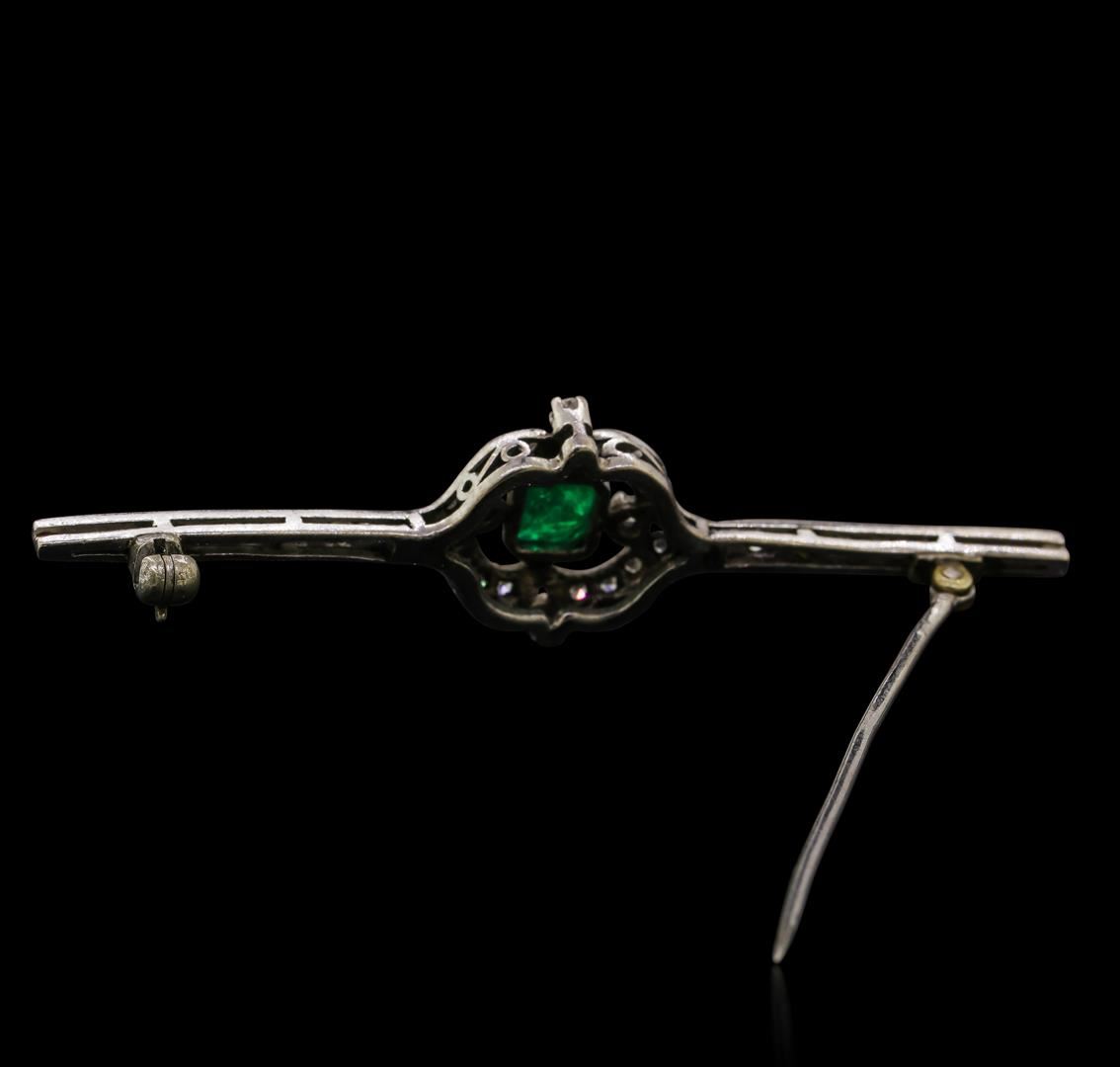 One electronically tested 10KT white gold lady's combination cast & assembled vintage fashion pin with a bright polish with milgrain detailing finish. Condition is used, good workmanship. Containing: One bezel set emerald standard step cut natural emerald, measuring 4.85 x 4.75 x 3.02mm, (depth est.) approximate weight of 0.51ct., clarity is heavily included, medium, moderately strong, green color, (GIA G 5/4), cut is good. Transmitting light somewhat diffusely, semi-transparent to translucent. Colored gemstones are presumed to have been subjected to commonly used enhancement processes. Graded in the setting. Thirty prong set single cut diamonds, measuring 1.40 - 1.10 x 0.78mm (depth est.) approximate total weight of 30 Stones = 0.23ct. Graded in the setting. Clarity VS-1 to SI-1. Color: H - I Cut Good. Total Weight of Colored Stones 0.51ct.. Total Weight of Diamonds 0.23ct.. Total Weight of Pin 3.30gm. GAS Appraised.