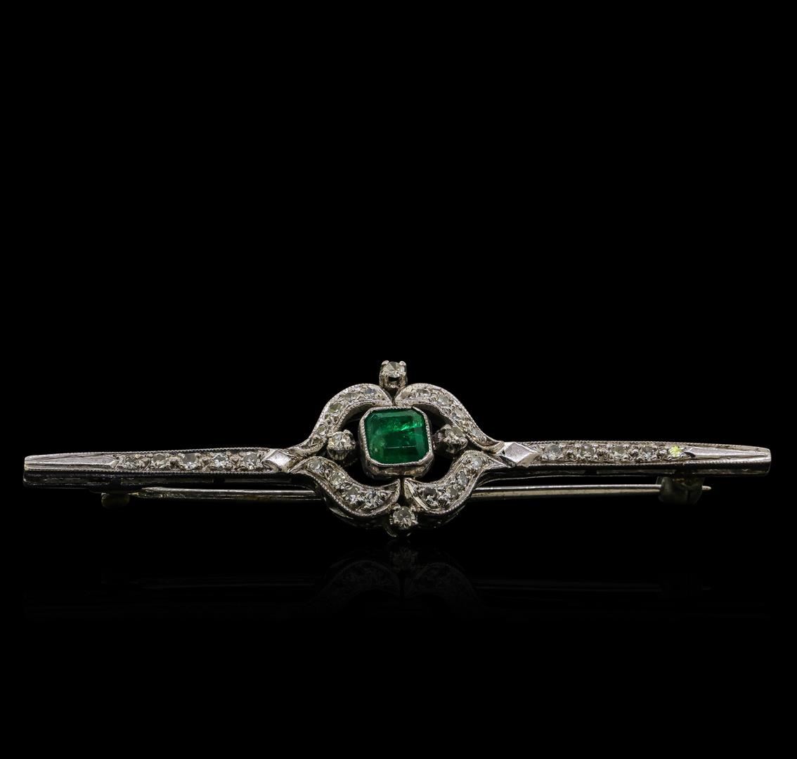 One electronically tested 10KT white gold lady's combination cast & assembled vintage fashion pin with a bright polish with milgrain detailing finish. Condition is used, good workmanship. Containing: One bezel set emerald standard step cut natural emerald, measuring 4.85 x 4.75 x 3.02mm, (depth est.) approximate weight of 0.51ct., clarity is heavily included, medium, moderately strong, green color, (GIA G 5/4), cut is good. Transmitting light somewhat diffusely, semi-transparent to translucent. Colored gemstones are presumed to have been subjected to commonly used enhancement processes. Graded in the setting. Thirty prong set single cut diamonds, measuring 1.40 - 1.10 x 0.78mm (depth est.) approximate total weight of 30 Stones = 0.23ct. Graded in the setting. Clarity VS-1 to SI-1. Color: H - I Cut Good. Total Weight of Colored Stones 0.51ct.. Total Weight of Diamonds 0.23ct.. Total Weight of Pin 3.30gm. GAS Appraised.