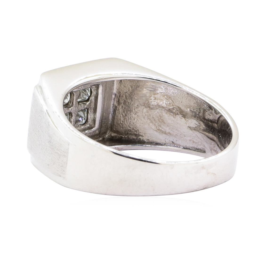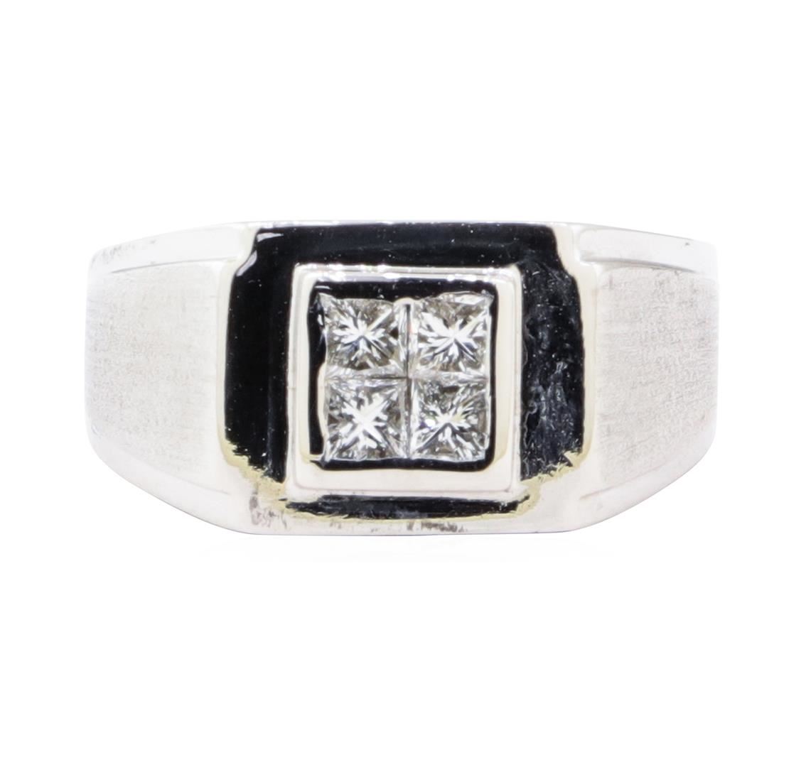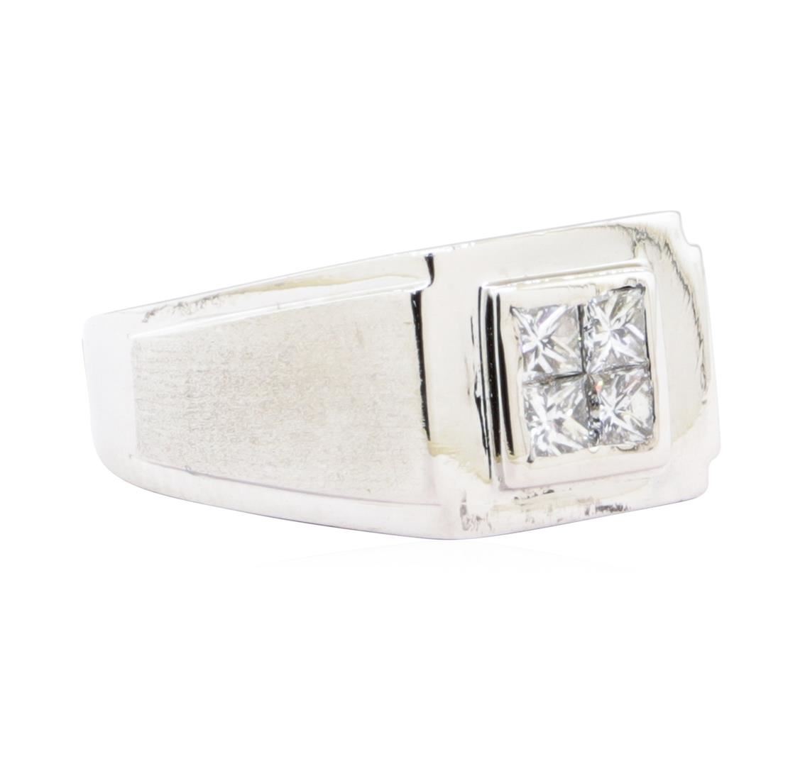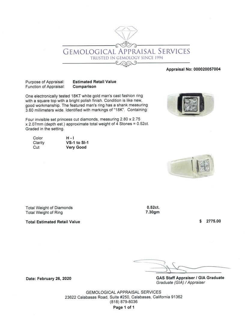 One electronically tested 18KT white gold man's cast fashion ring with a square top with a bright polish finish. The featured man's ring has a shank measuring 3.60 millimeters wide. Identified with markings of '18K'. Condition is Good. Containing: Four invisible set princess cut diamonds, measuring 2.80 x 2.75 x 2.07mm (depth est.) approximate total weight of 4 Stones = 0.52ct. Graded in the setting. Color H - I Clarity VS-1 to SI-1 Cut Very Good. Total Weight of Diamonds 0.52ct.. Total Weight of Ring 7.30gm GAS Appraised at $2775.00. GAS Appraised.