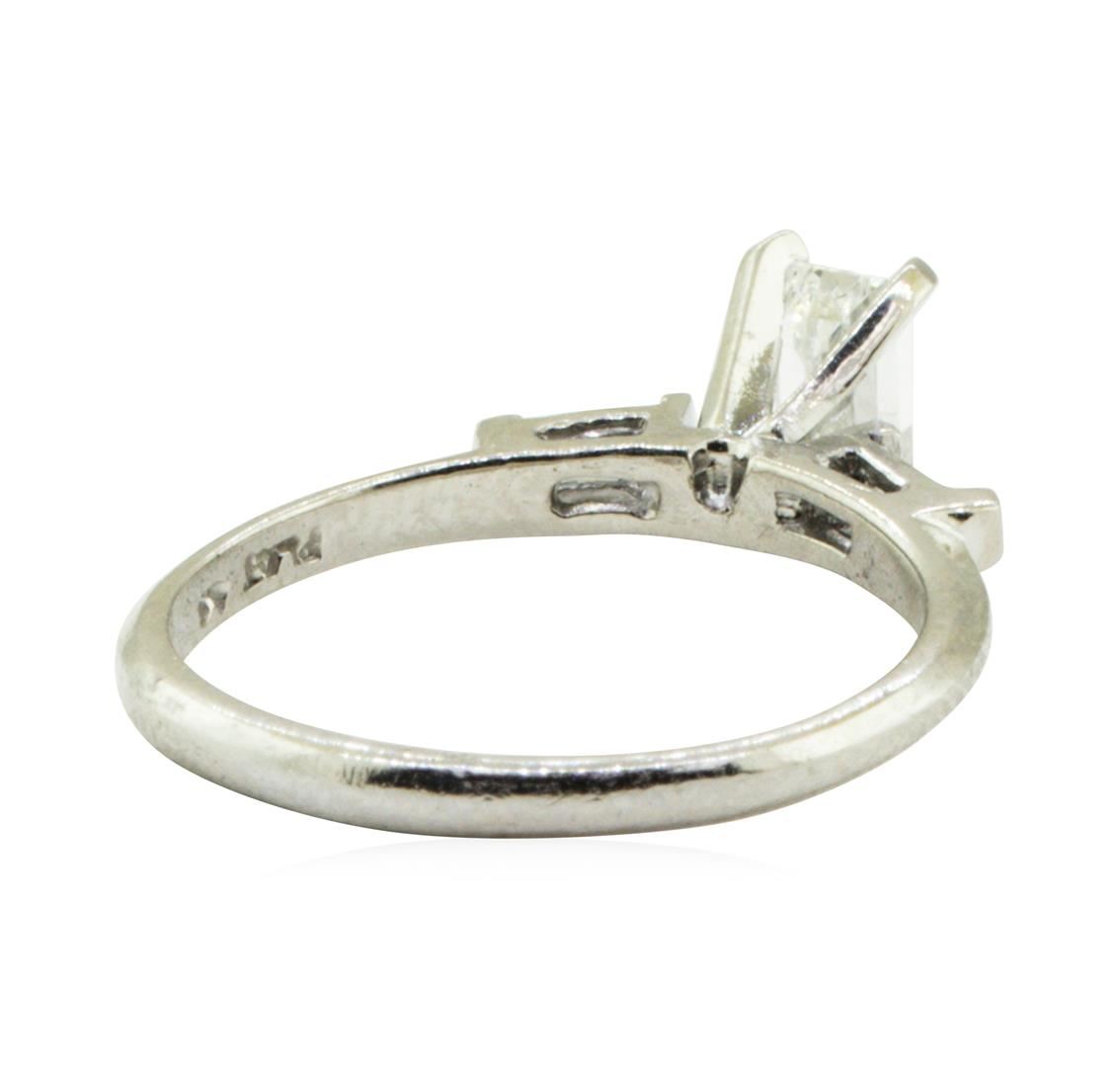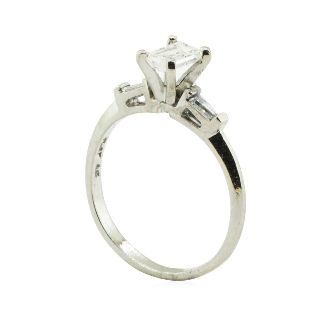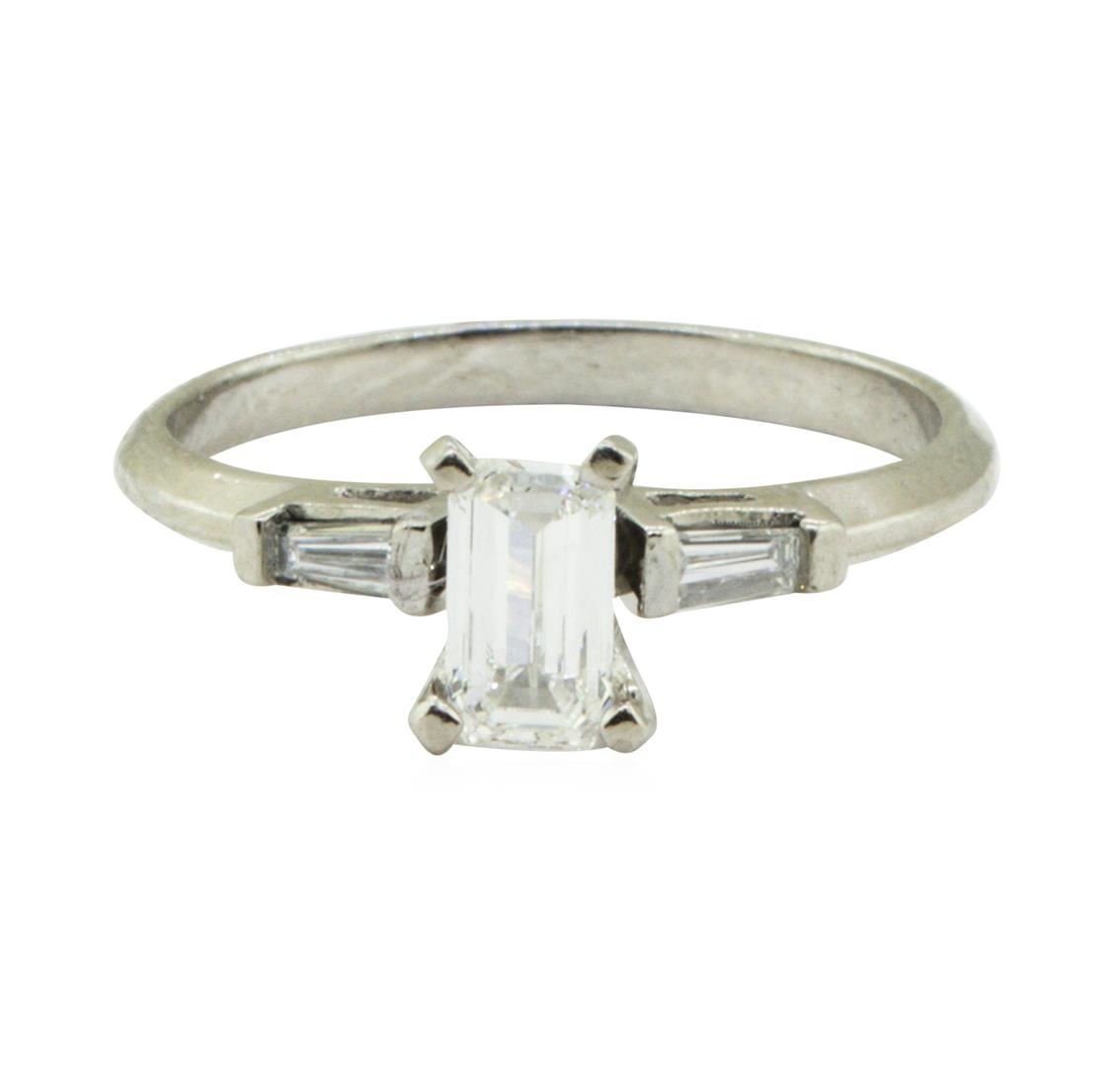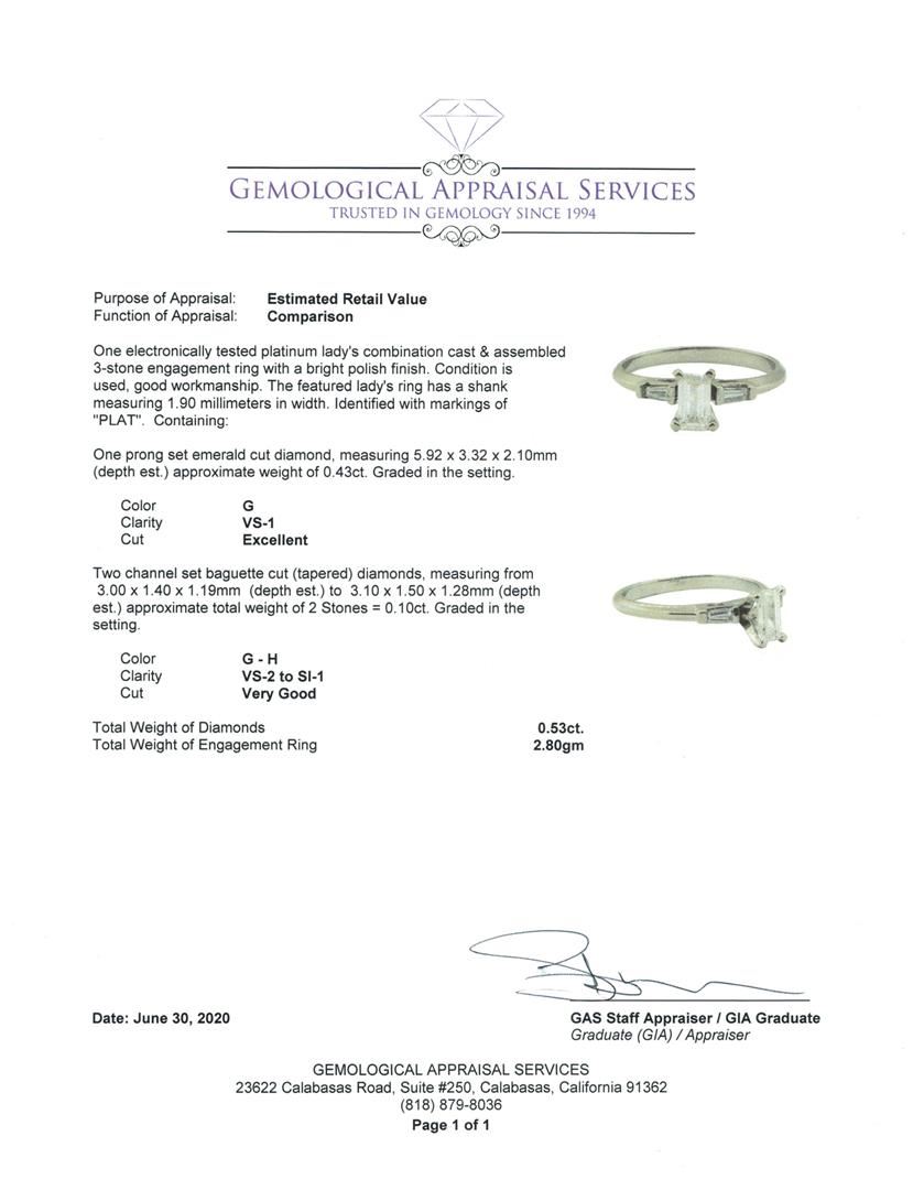 One electronically tested platinum lady's combination cast & assembled 3-stone engagement ring with a bright polish finish. The featured lady's ring has a shank measuring 1.90 millimeters in width. Identified with markings of 'PLAT'. Condition is used, good workmanship. Containing: One prong set emerald cut diamond, measuring 5.92 x 3.32 x 2.10mm (depth est.) approximate weight of 0.43ct. Graded in the setting. Color G Clarity VS-1 Cut Excellent Two channel set baguette cut (tapered) diamonds, measuring from 3.00 x 1.40 x 1.19mm (depth est.) to 3.10 x 1.50 x 1.28mm (depth est.) approximate total weight of 2 Stones = 0.10ct. Graded in the setting. Color G - H Clarity VS-2 to SI-1 Cut Very Good. Total Weight of Diamonds 0.53ct.. Total Weight of Engagement Ring 2.80gm GAS Appraised at $3145.00. GAS Appraised.
