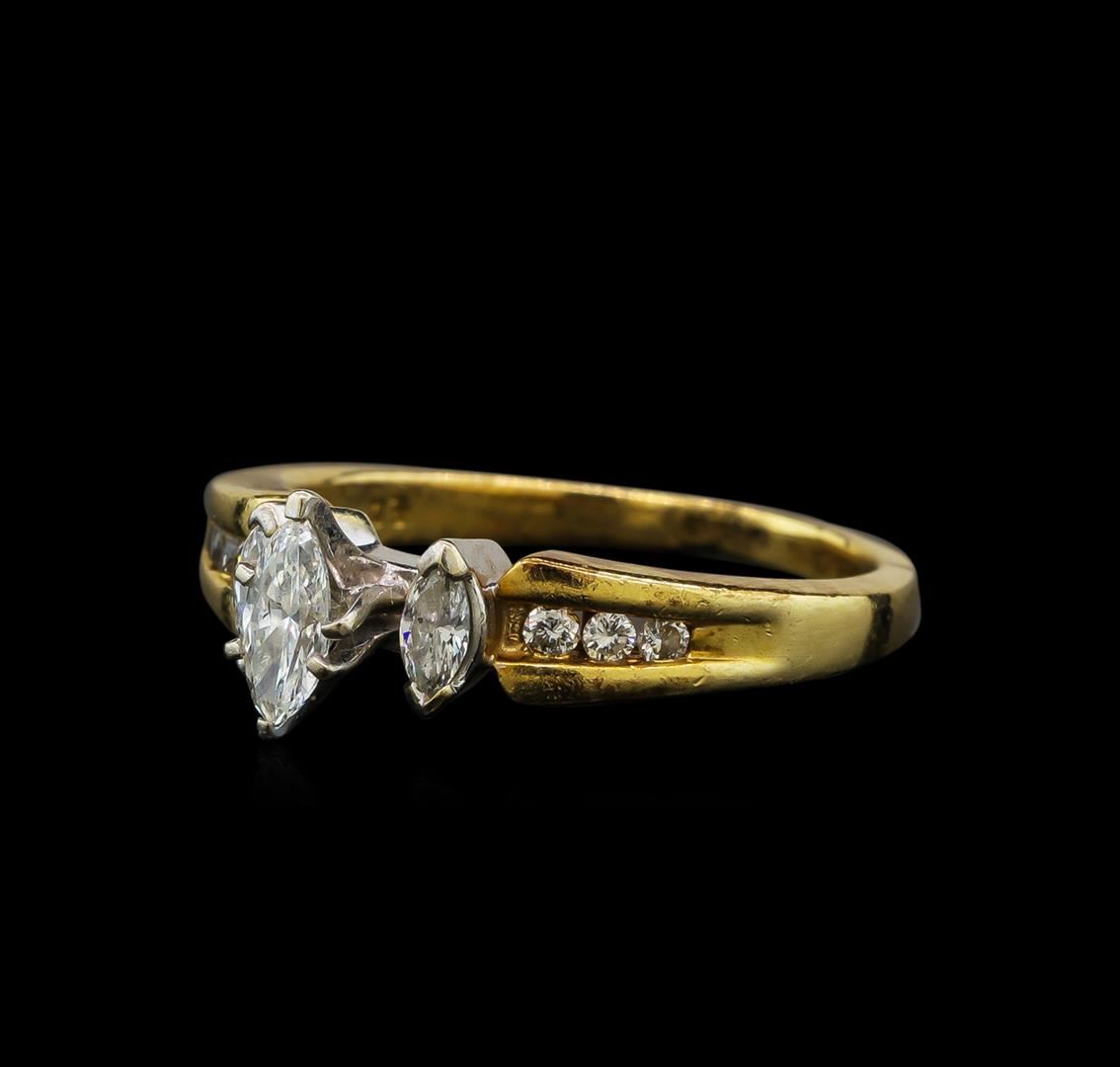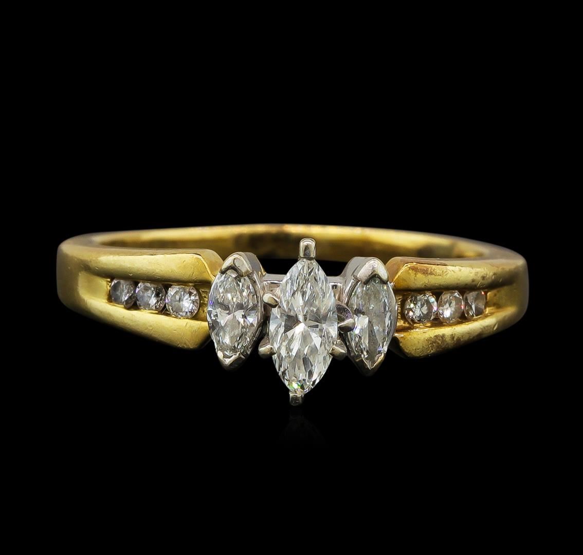 One electronically tested 14KT yellow and white gold ladies cast & assembled diamond unity ring with a bright polish finish. The ring features a cathedral set marquise diamond accented by a single marquise diamond on either side and supported by diamond set shoulders. The ring is completed by a one and one-half millimeter wide band. Identified with markings of '14K'. Condition is good. Containing: One prong set marquise shaped cut diamond, measuring 6.20 x 3.00 x 2.10mm (depth est.) approximate weight of 0.25ct. Graded in the setting. Clarity SI-2. Color: I Two prong set marquise shaped cut diamonds, measuring 4.20 x 2.20 x 1.39mm (depth est.) approximate total weight of 2 Stones = 0.16ct. Graded in the setting. Clarity SI-1 to SI-2. Color: H Six channel set round brilliant cut diamonds, measuring 1.60 - 1.50 x 0.93mm (depth est.) approximate total weight of 6 Stones = 0.12ct. Graded in the setting. Clarity SI-2 to I-1. Color: G - I. Total Weight of Diamonds 0.53ct.. Total Weight of Ring 4.18gm. AIG Appraised.