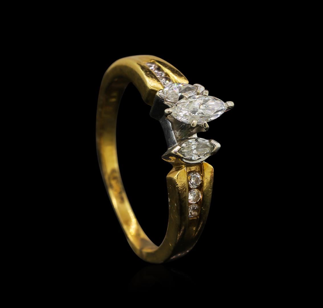 One electronically tested 14KT yellow and white gold ladies cast & assembled diamond unity ring with a bright polish finish. The ring features a cathedral set marquise diamond accented by a single marquise diamond on either side and supported by diamond set shoulders. The ring is completed by a one and one-half millimeter wide band. Identified with markings of '14K'. Condition is good. Containing: One prong set marquise shaped cut diamond, measuring 6.20 x 3.00 x 2.10mm (depth est.) approximate weight of 0.25ct. Graded in the setting. Clarity SI-2. Color: I Two prong set marquise shaped cut diamonds, measuring 4.20 x 2.20 x 1.39mm (depth est.) approximate total weight of 2 Stones = 0.16ct. Graded in the setting. Clarity SI-1 to SI-2. Color: H Six channel set round brilliant cut diamonds, measuring 1.60 - 1.50 x 0.93mm (depth est.) approximate total weight of 6 Stones = 0.12ct. Graded in the setting. Clarity SI-2 to I-1. Color: G - I. Total Weight of Diamonds 0.53ct.. Total Weight of Ring 4.18gm. AIG Appraised.