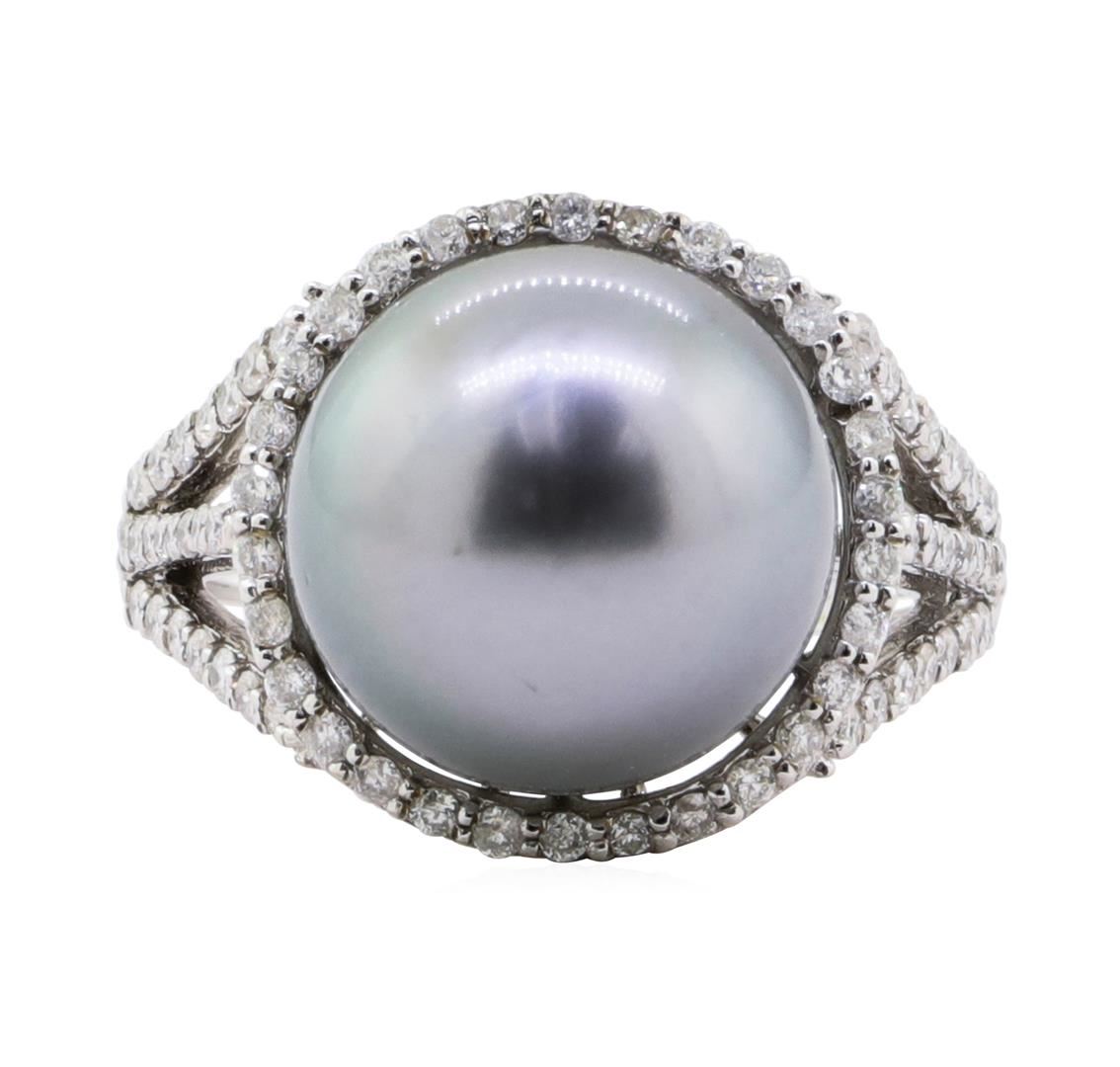 One electronically tested 14KT white gold ladies cast & assembled Tahitian cultured pearl & diamond ring. The ring features a Tahitian cultured pearl set within a diamond bezel, supported by diamond set three way split shoulders, completed by a two millimeter wide band. Bright polish finish. Trademark is Orianne. Identified with markings of "14K". Condition is new, good workmanship. Containing: One Tahitian cultured pearl, 12.0mm in size. The pearl is 06 in color with a good luster, round, mostly clean Graded in the setting. Tahitian cultured pearls form in the large "Black Lipped" Pinctada Margaritiferid oyster, which is about twice the size of the Japanese Akoya oyster. This warm water species from across the central and South Pacific Ocean is at home in the bays and lagoons of the islands & atolls of French Polynesia. Tahitian cultured pearl farmers generally raise their oysters in lagoons. Tahitian cultured pearls take from two to four years to form. Black pearls are known for their iridescent, vibrant, almost metallic natural colors, unique among saltwater cultured pearls. Though commonly called "Tahitian" pearls, they are actually gray, to a lighter or darker degree. Tahitian pearls have the unique ability to display a variety of colors at the same time, which can be seen glistening on their surface. Seventy-Four prong set round brilliant cut diamonds exact total weight 74 Stones = 0.53ct. Graded in the setting. Clarity I-1 to I-2 Color F - H Total Weight of Diamonds 0.53 ct. Total Weight of Ring 5.50 gm Estimated Retail Value $ 3,960.00 US